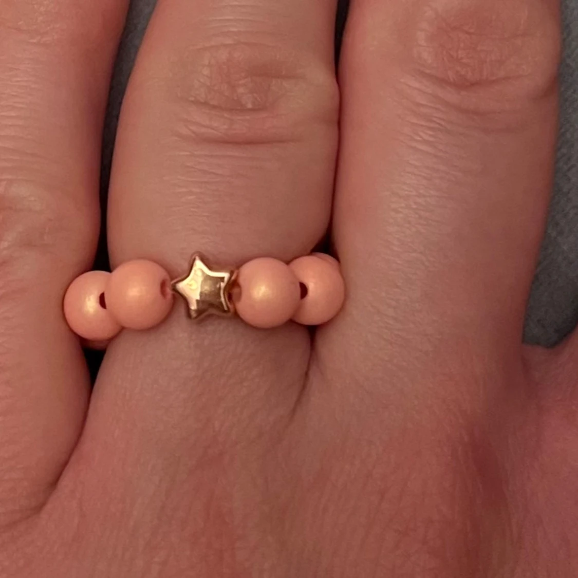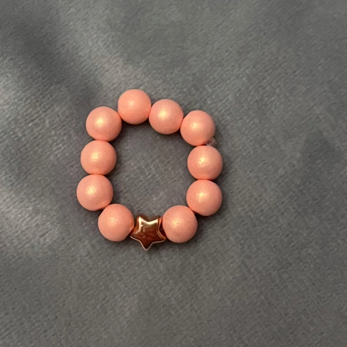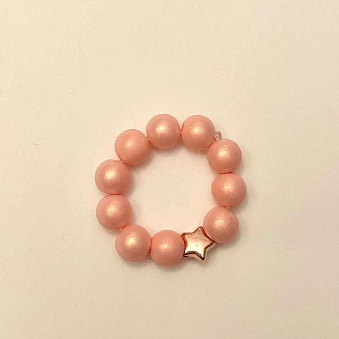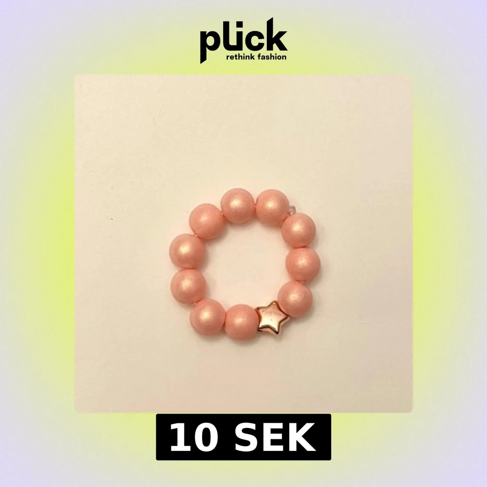 Så söt pärlad ring. Träpärlor och en liten stjärna. Trädd på elastisk tråd så passar de flesta. Perfekt liten accessoar till sommaren!