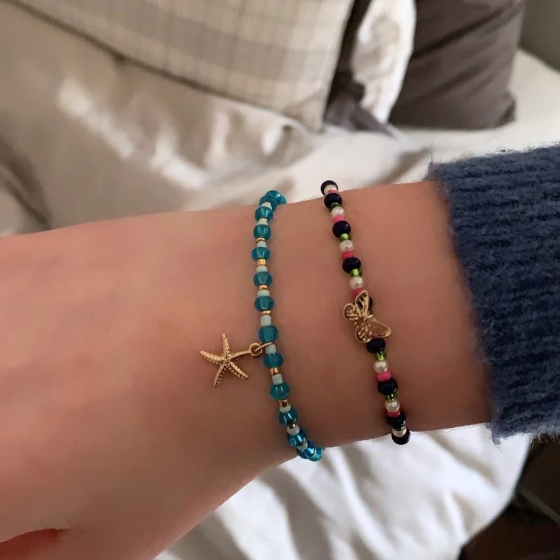 Pärl armband som jag har gjort själv, 35 kr st inklusive frakt. Två för 60! Passar dom flesta eftersom att dom är gjorda på elastisk tråd.👩🎨💓