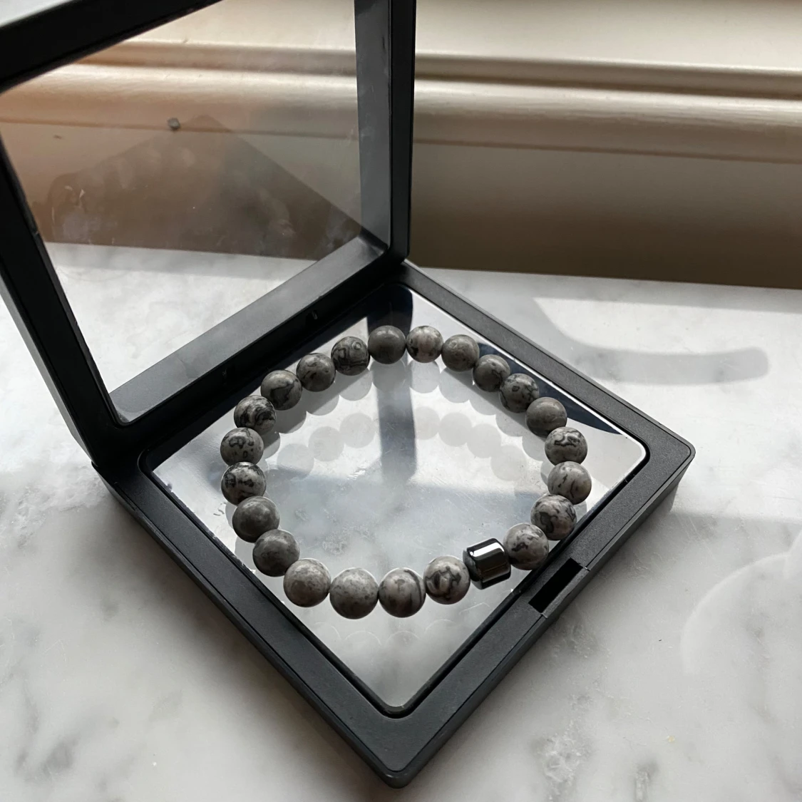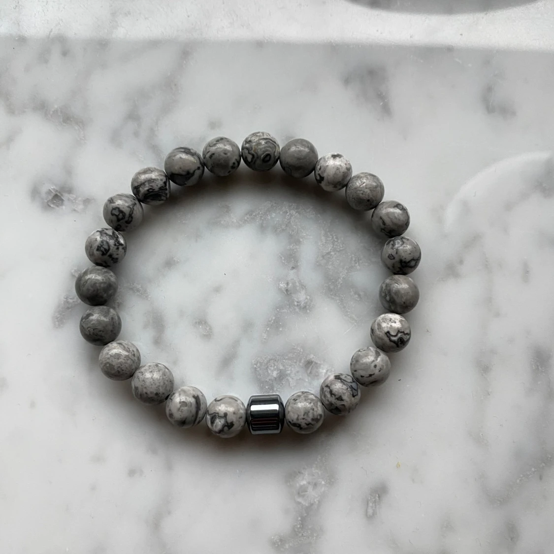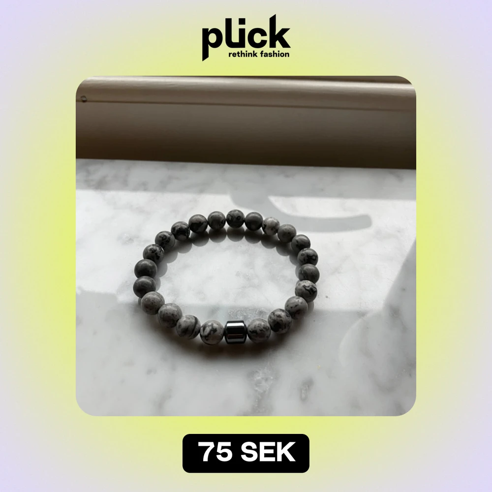 Snyggt grått pärlarmband med marmorerade stenar och en cool metallisk kubdetalj. Perfekt för att ge din outfit en stilren touch. Armbandet är elastiskt och passar de flesta handleder. Perfekt accessoar för både vardag och fest! Ändå är använd ett fåtal gånger