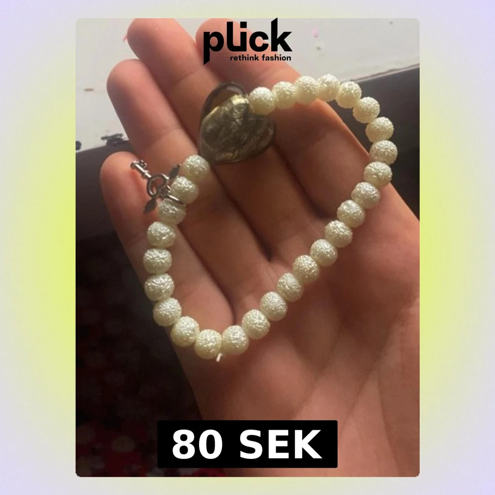Unikt pärlarmband med glittrande vita pärlor och ett stort hjärthänge i mörk ton med guldskimmer. Låset är dekorerat med en liten nyckel och vingar, vilket ger en cool och personlig touch. Perfekt accessoar för att lyfta din stil.