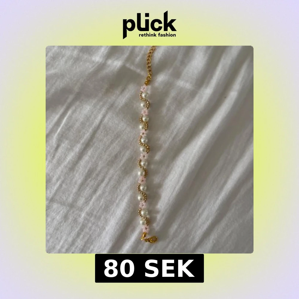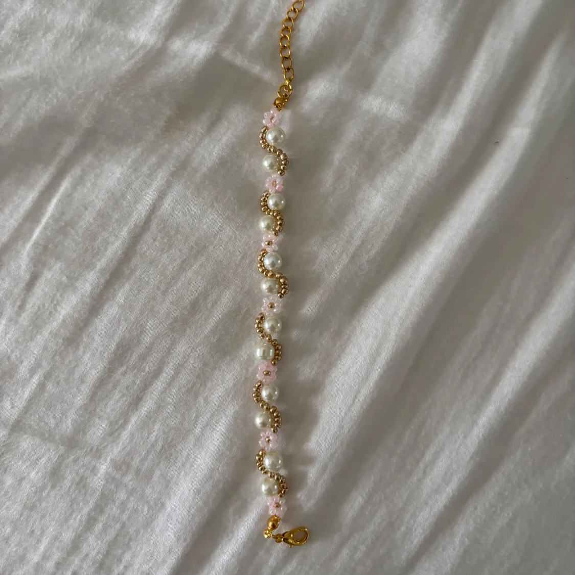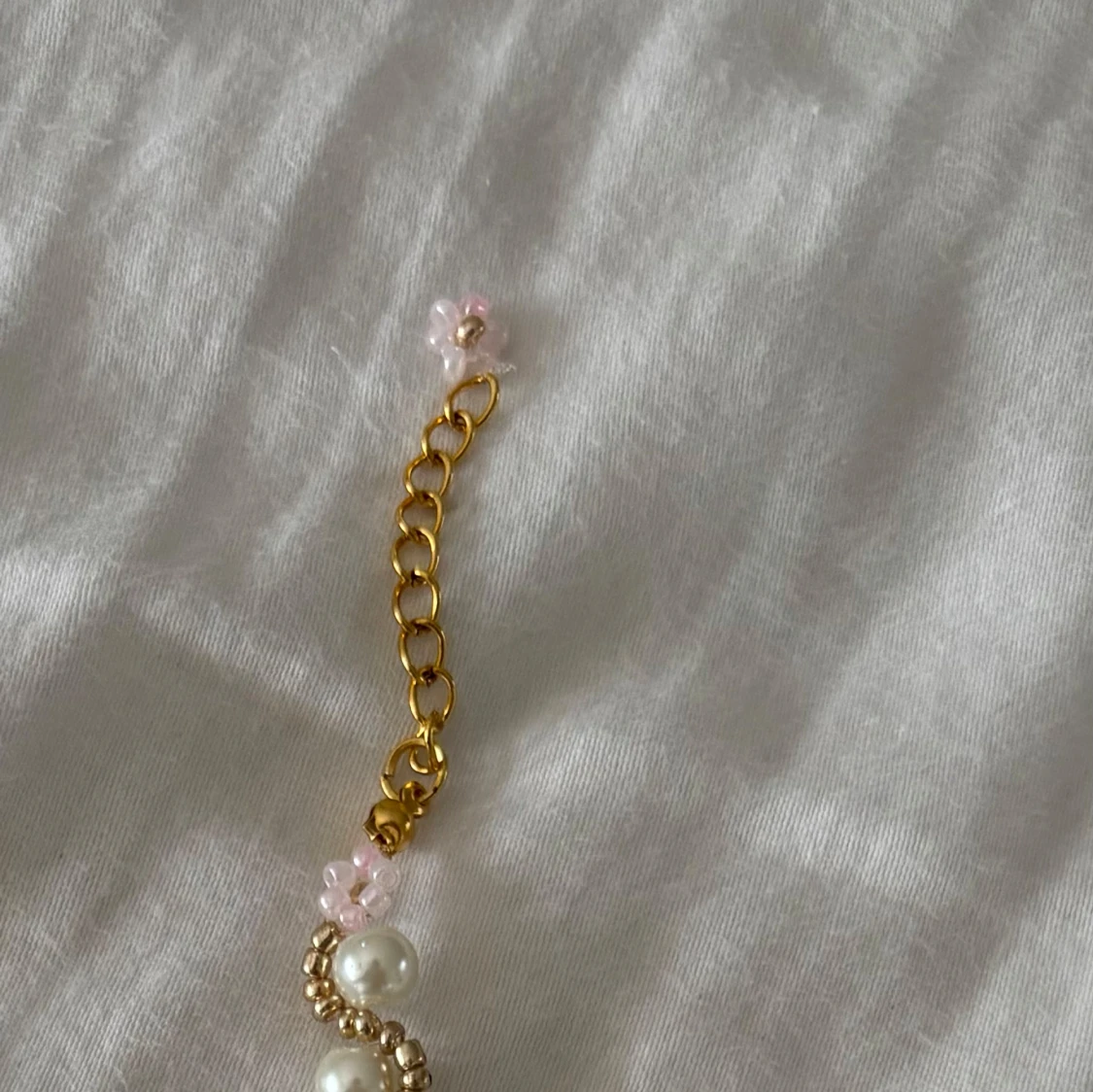 Superfint armband med vita pärlor, små guldfärgade pärlor i spiral och söta ljusrosa blommor. Armbandet har guldfärgad kedja och lås, perfekt för att ge din outfit en söt och trendig touch. Görs på beställning, blommorna går att fixa i andra färger ifall det önskas. 15cm + 4cm förlängningskedja, längden kan anpassas efter önskemål.