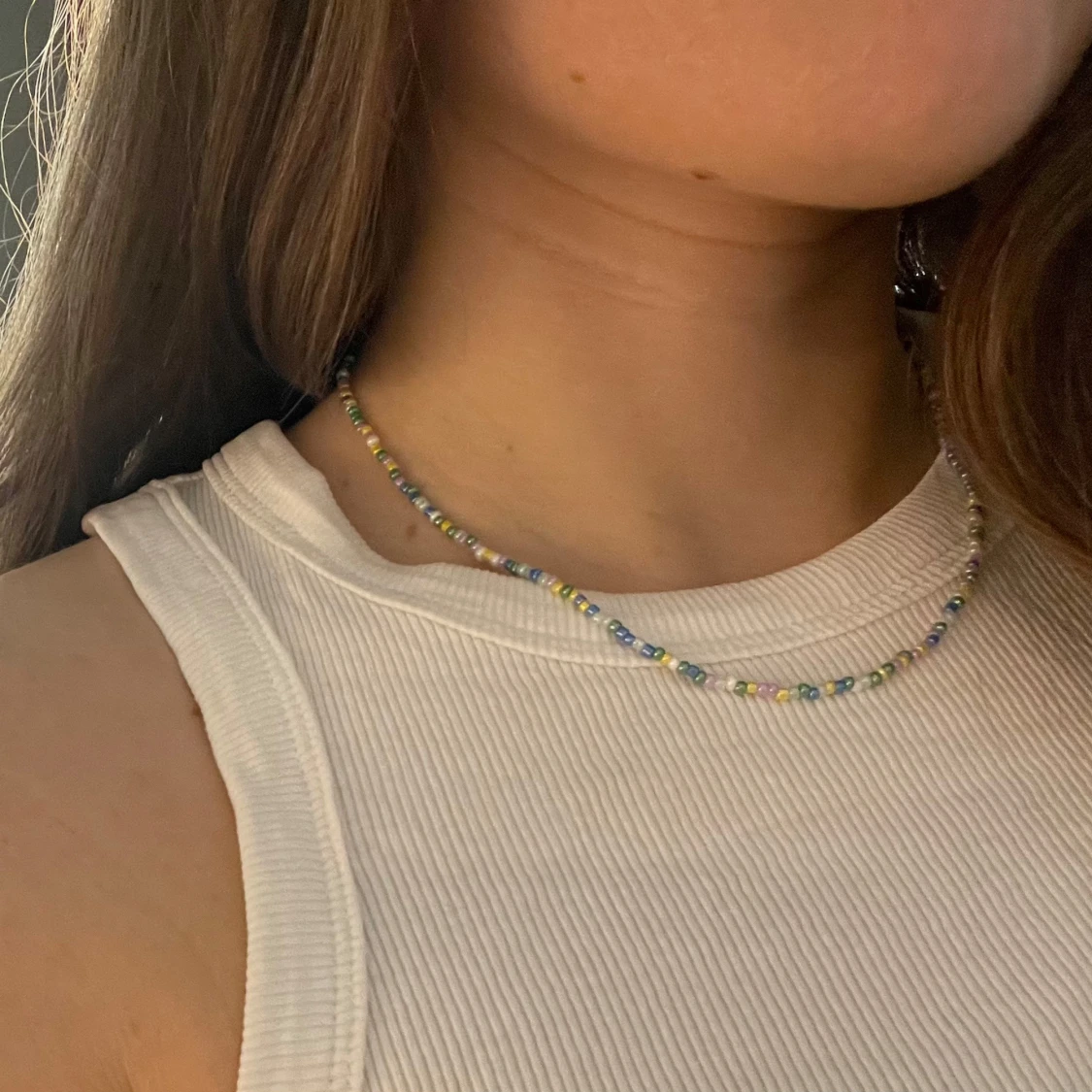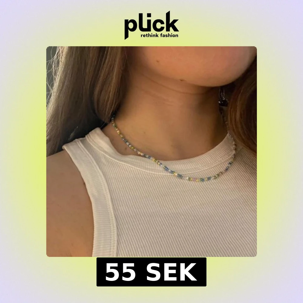 Säljer ett färgglatt halsband med små pärlor i olika nyanser av blått, grönt, gult, rosa och lila. Halsbandet har ett enkelt lås i metall och är perfekt för att ge en färgklick till din outfit. Passar både till vardag och speciella tillfällen. Färgerna visas rättvisast på första bilden.