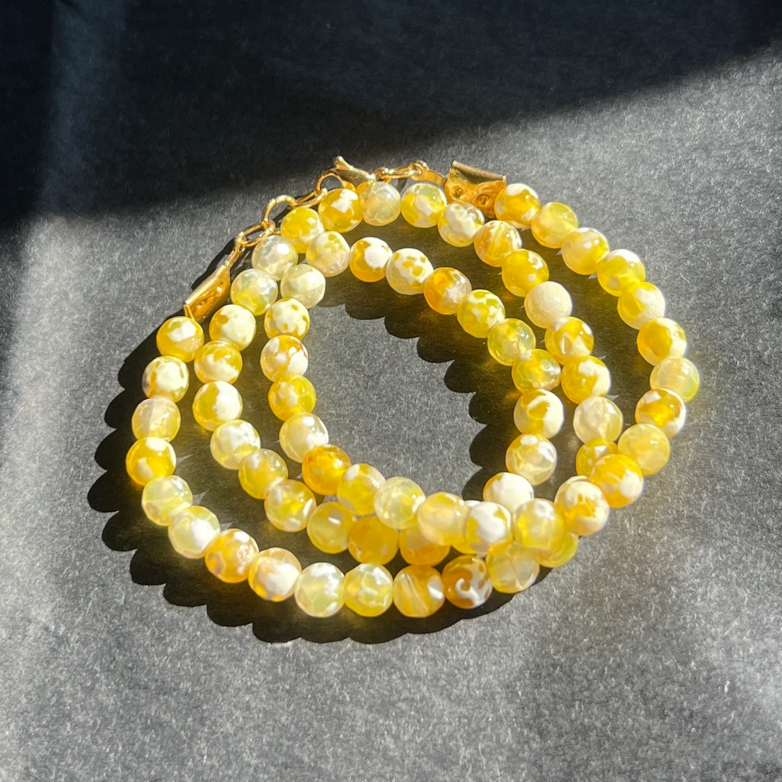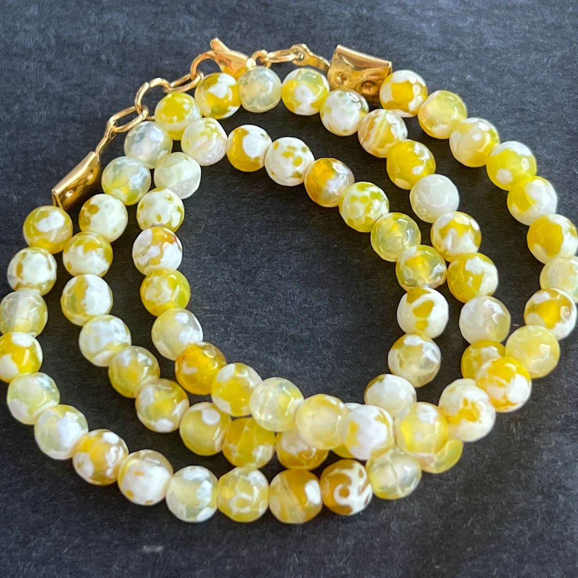 Super snyggt halsband med speciella gula pärlor med lite vitt i. Halsbandet är elastiskt och är cirka 40cm. Tillkommer spänne så man kan justera det efter önskad storlek. Obs frakten är 15kr