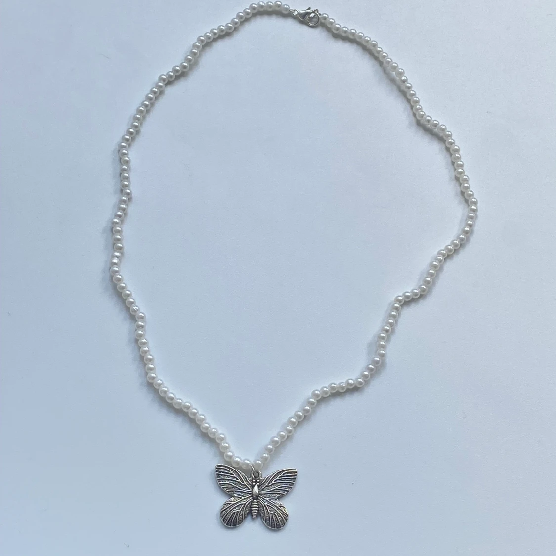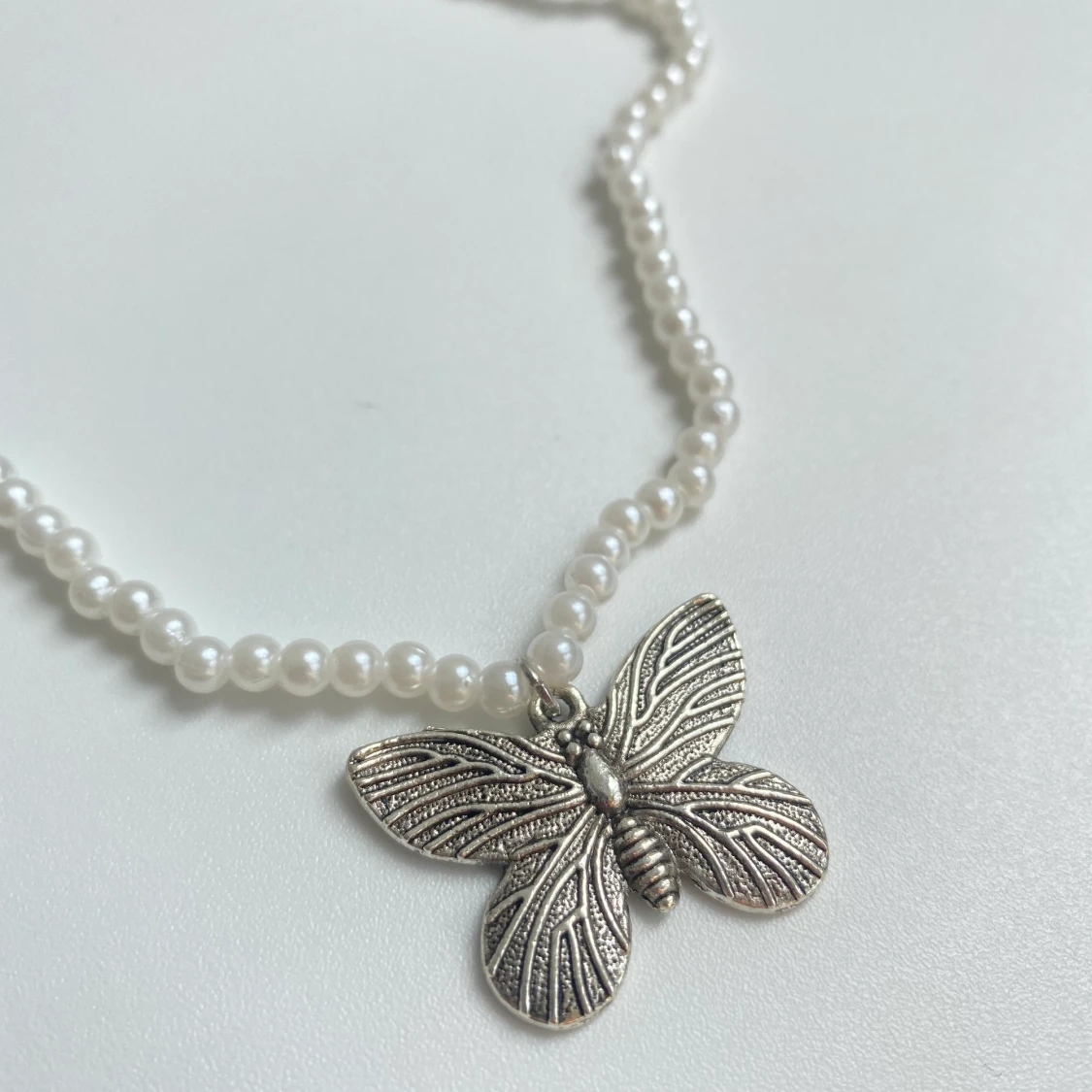 Pärlhalsband med fjärilsberlock. Silverpläterat🤍