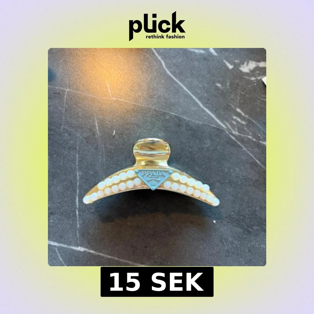 Snygg guldig hårklämma dekorerad med vita pärlor längs båda sidor. Klämman har en klassisk form och ett blått plast på sidan. Perfekt accessoar för att lyfta din frisyr med en lyxig touch.