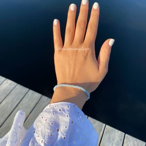 Pärlarmband av skimrande glaspärlor i ljusblåa och ljusgröna nyanser. Perfekt att kombinera med andra smycken! Armbandet är ihopsatt med hållbar elastisk tråd och passar de flesta handleder. SLUTSÅLD! ☀️
