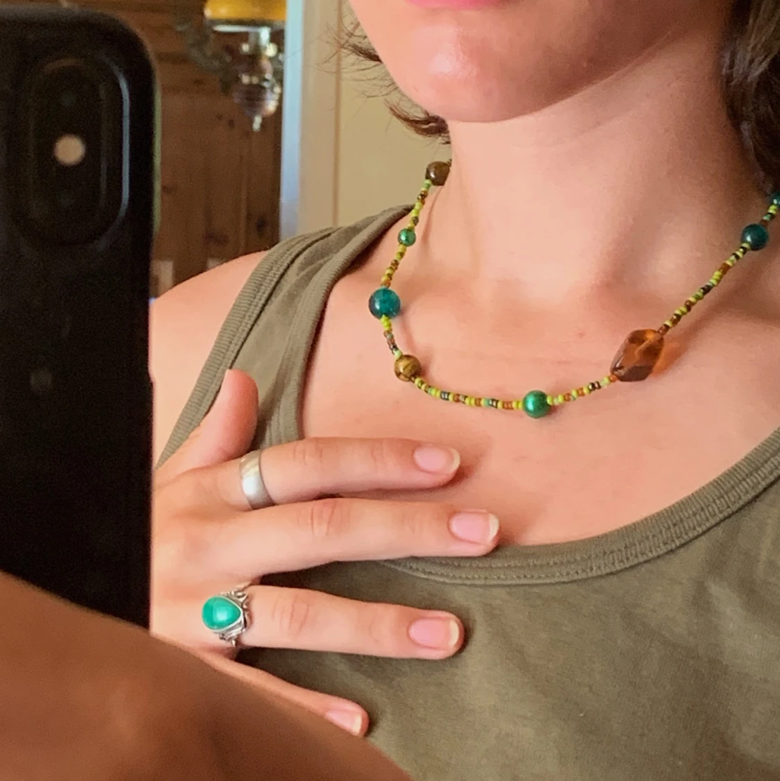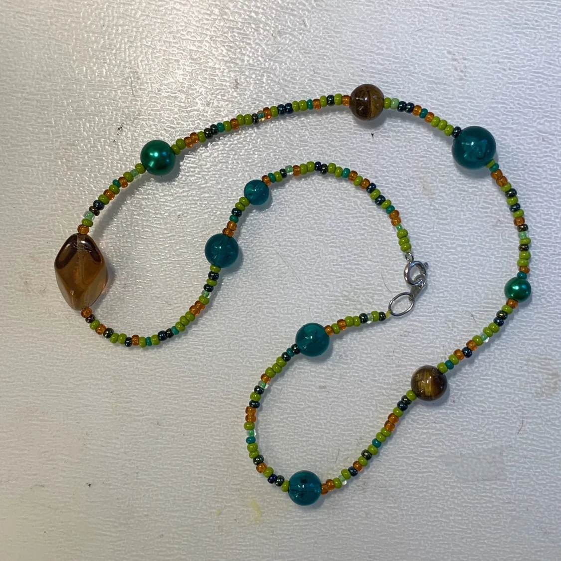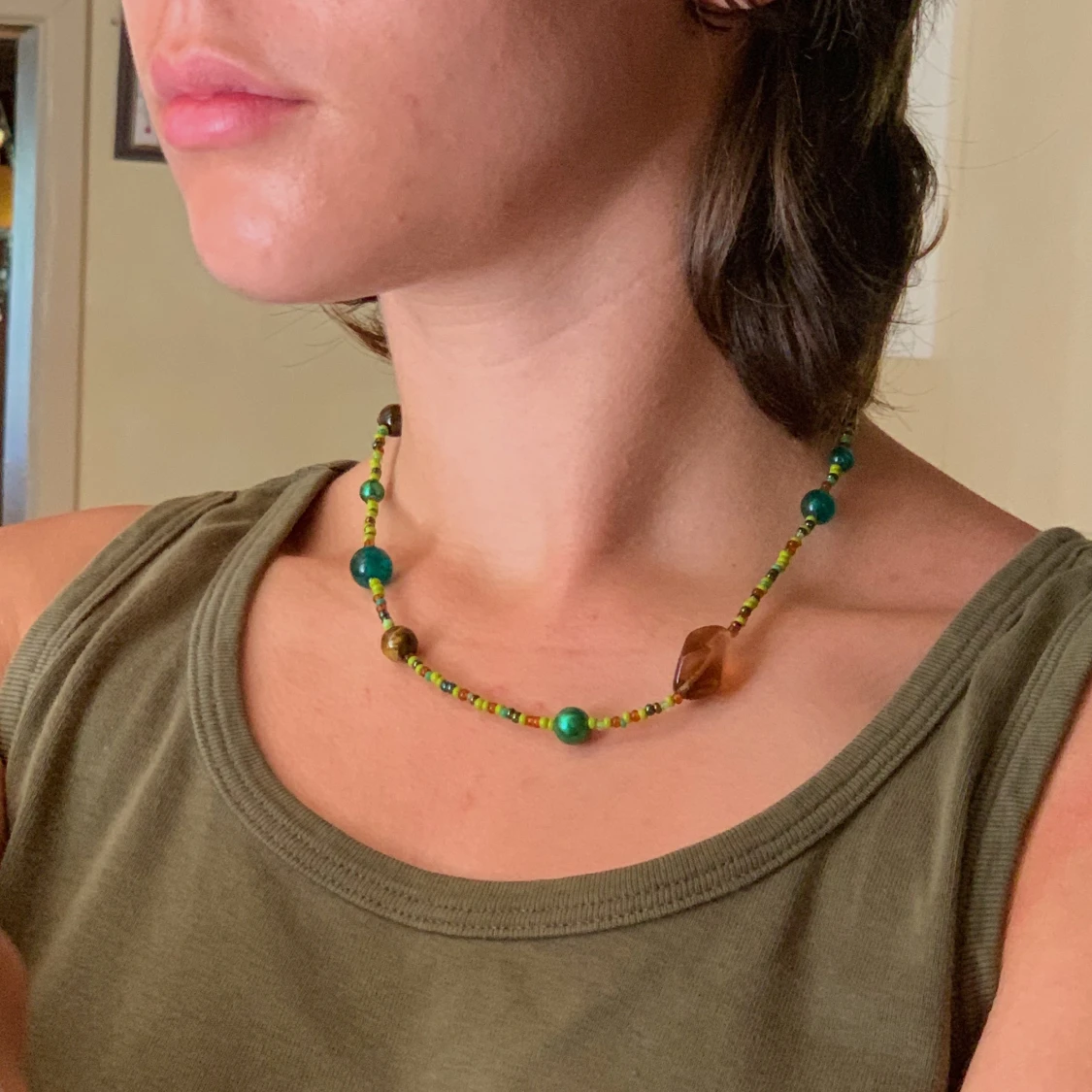 Pärlhalsband med olika bruna och gröna pärlor i olika storlekar och pärlor av kristallen tigeröga🌲🪵🌱🐅