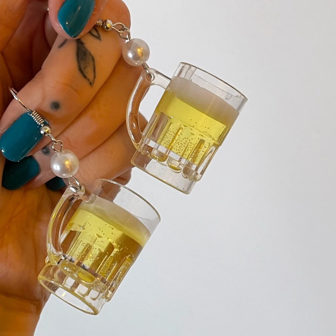 Helt oanvända örhängen i form av ganska stora ölglas, med pärlor. Kan ju inte bli mer festligt amirite? 🍻