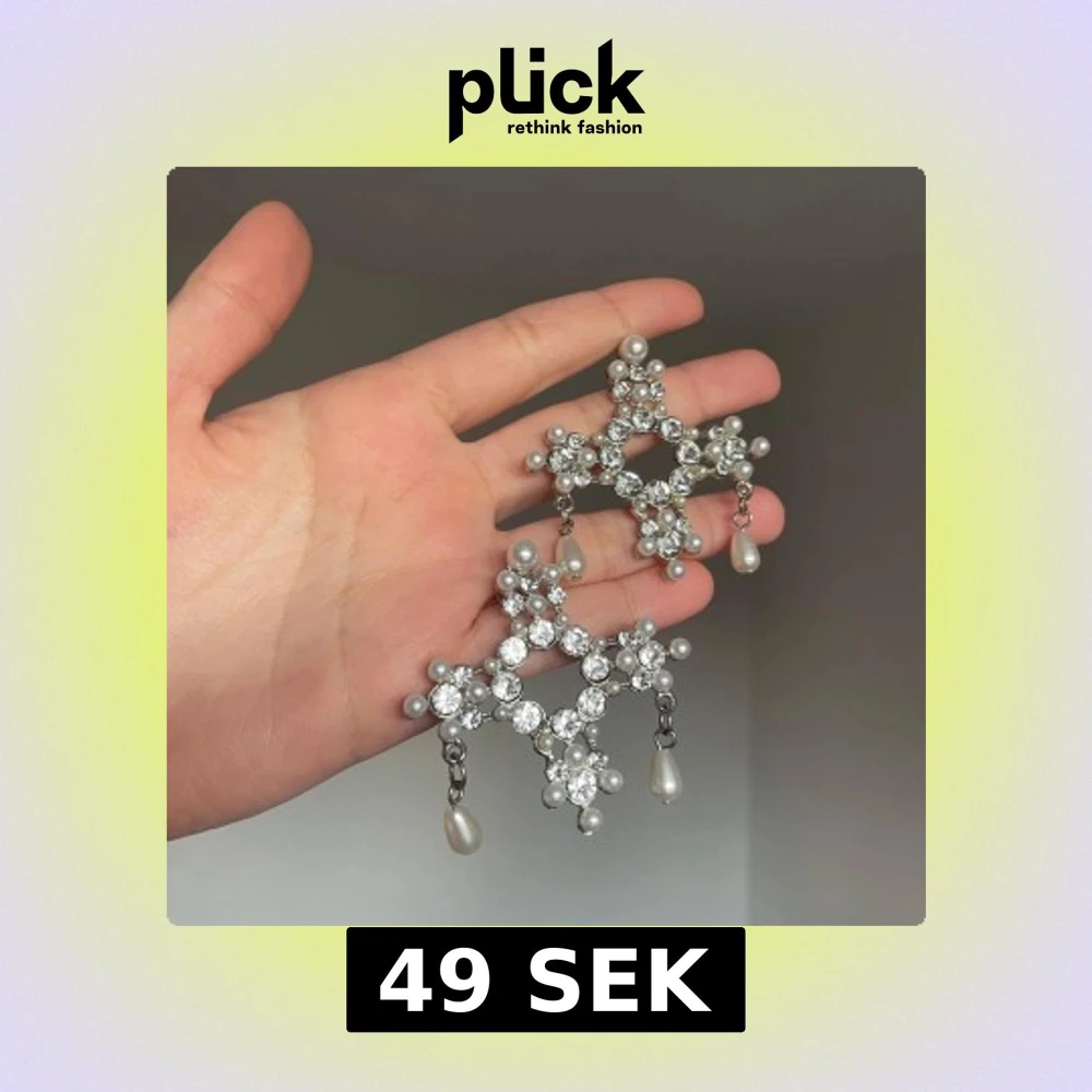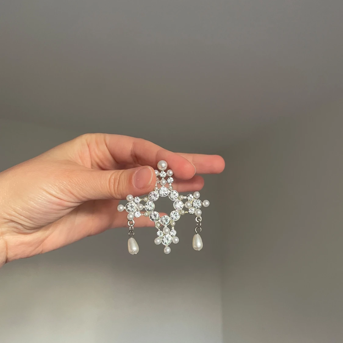 Stora statement-örhängen i silverfärg med massor av glittrande strass och vita pärlor. De har en unik stjärnformad design och hängande droppformade pärlor som ger extra wow-känsla. Perfekta för att sticka ut och ge din look en lyxig touch. Det saknas fäste på en örhänge.