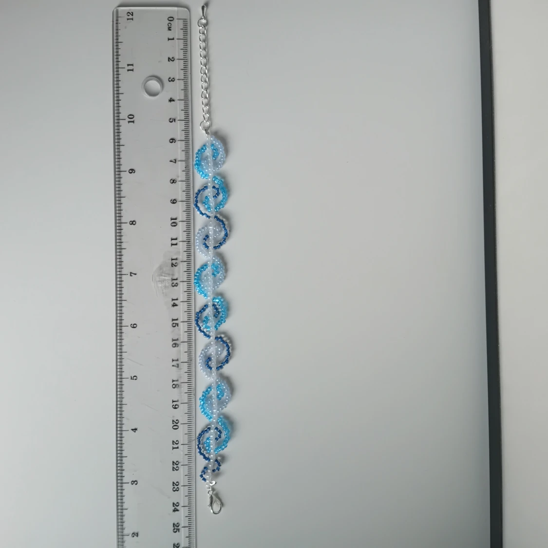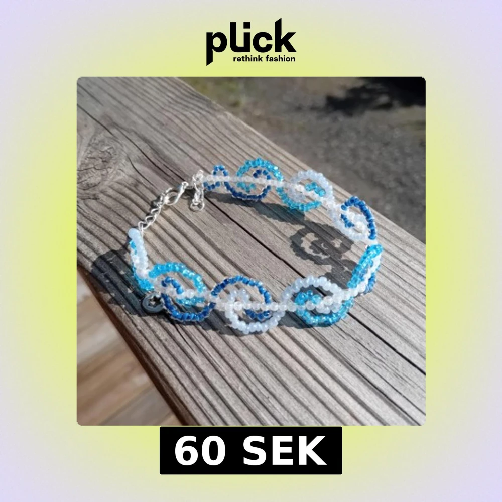 Handgjort unikt armband gjort av små pärlor i blått och vitt. Pärlorna är trädda i ett spiral/vågor mönster som ger en cool och lekfull look. Armbandet har justerbar kedja och karbinhake i silverfärg. Perfekt accessoar för att lyfta din outfit.