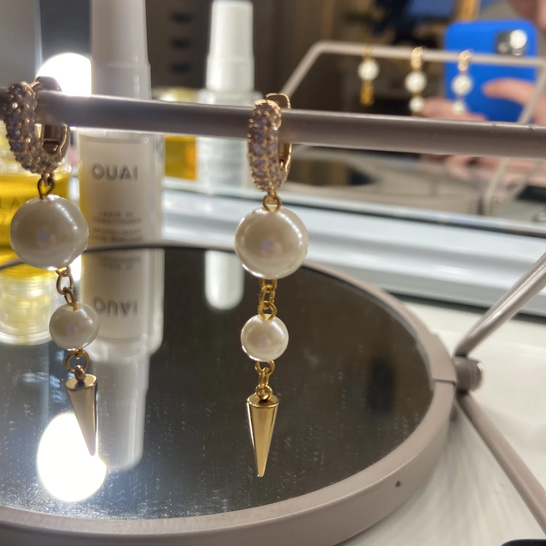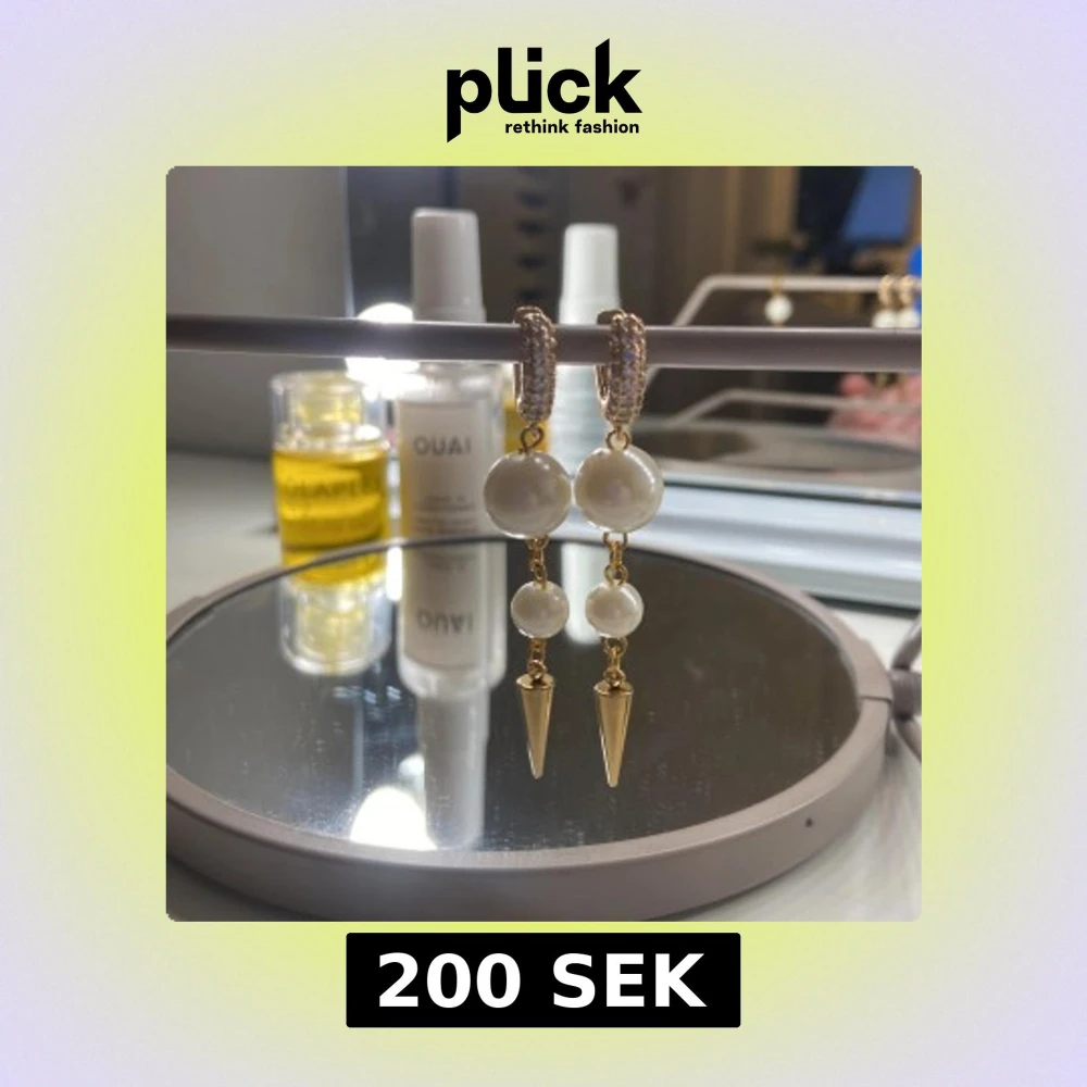 Eleganta guldörhängen med två vita pärlor och spetsdetaljer. De har en unik design med en spetsig gulddetalj som hänger nedanför pärlorna. Perfekta för att ge en lyxig touch till din outfit.