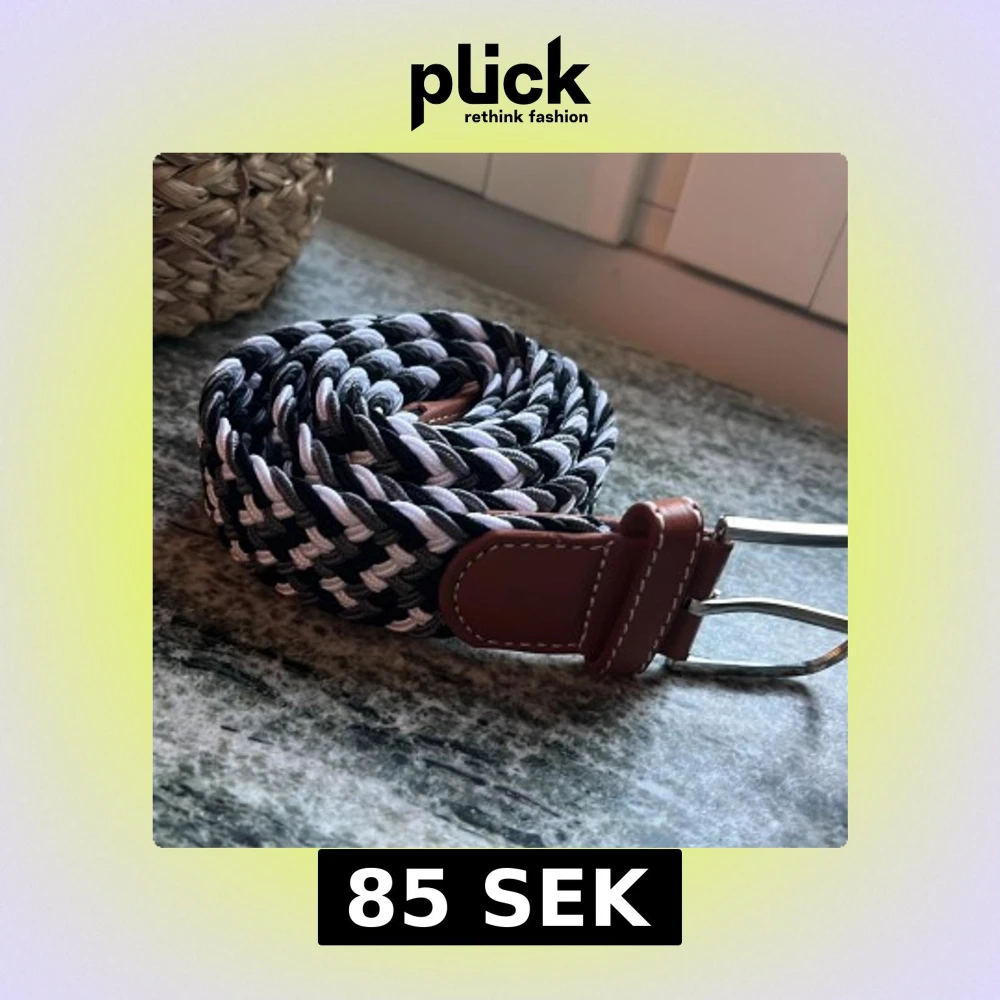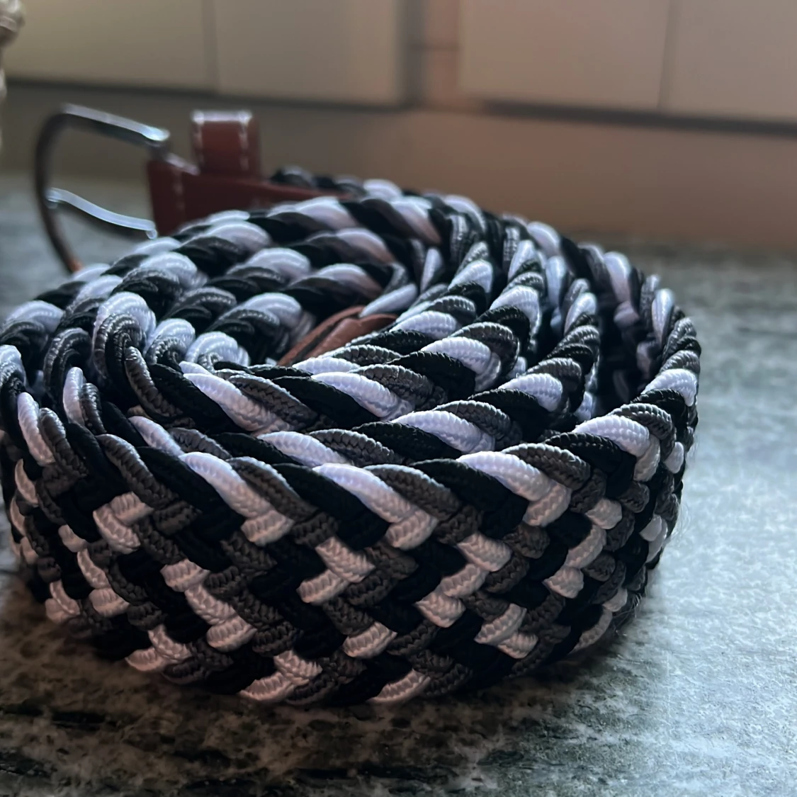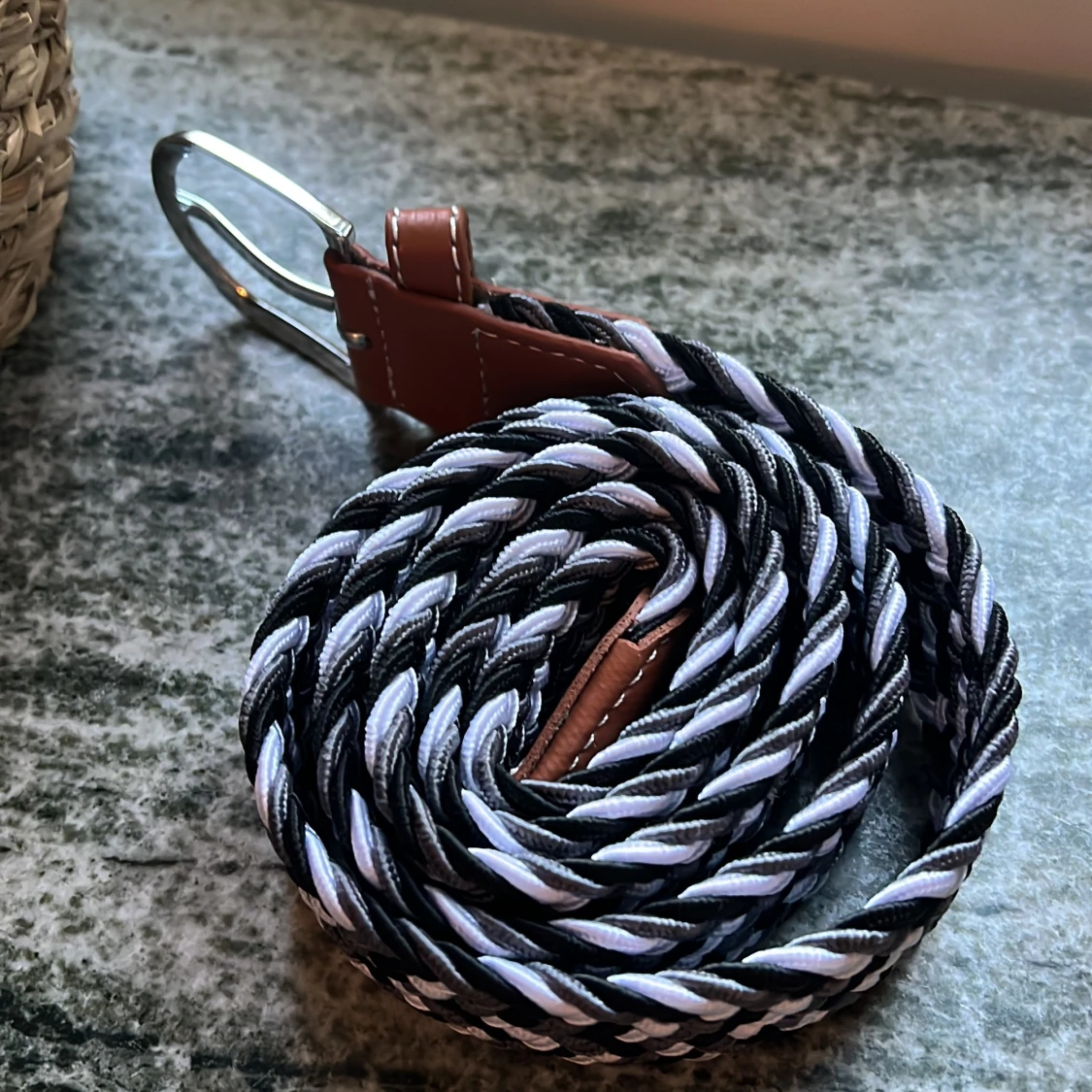 Snyggt flätat bälte i svart, vitt och grått med bruna läderdetaljer vid spännet. Bältet har ett coolt mönster och är gjort av syntetmaterial med en klassisk metallspänne. Perfekt för att ge outfiten lite extra edge.