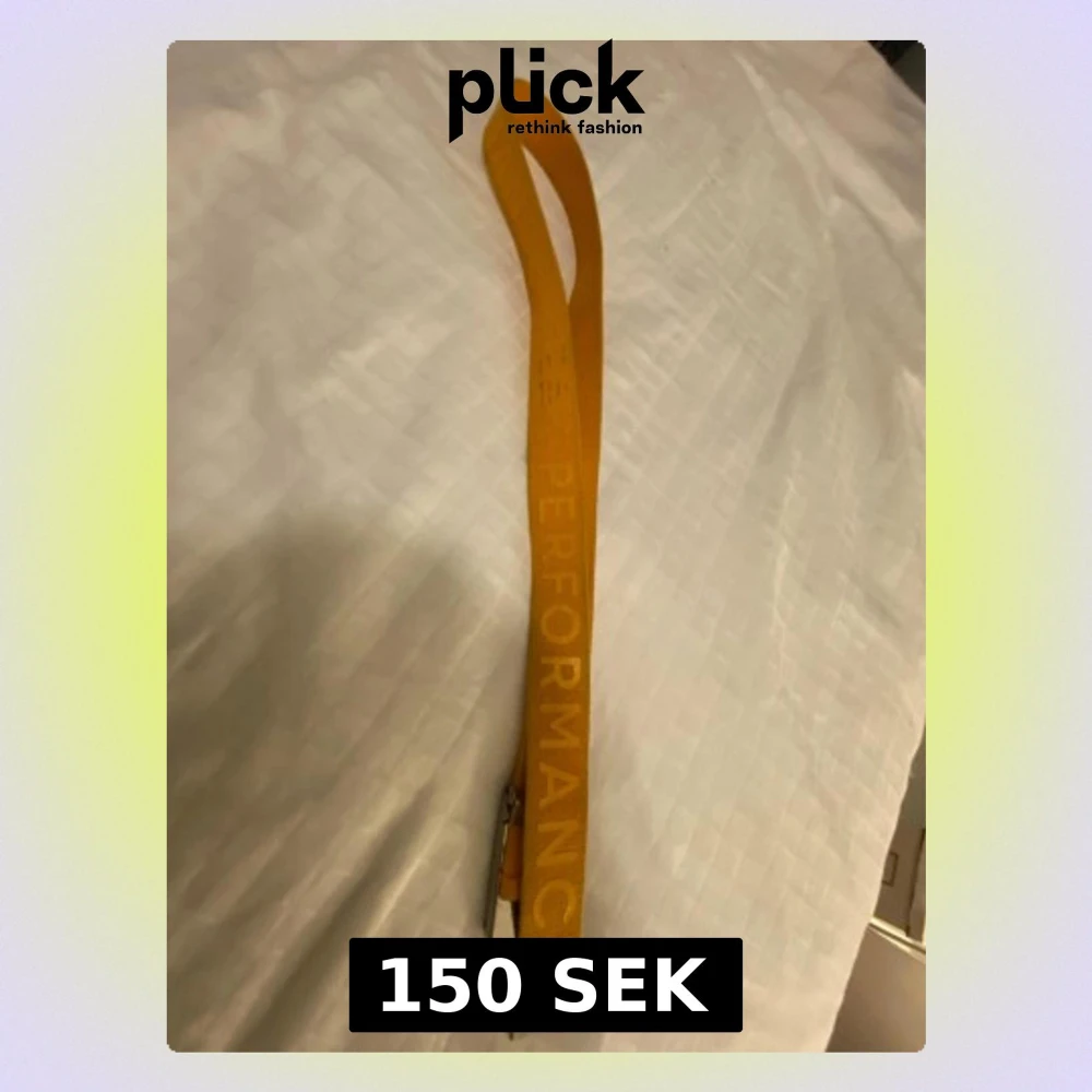 Säljer ett använt gult tygbälte från Peak Performance med texten 'PERFORMANCE' längs bandet. Bältet har ett metallspänne med Peak Performance-loggan ingraverad. Perfekt accessoar för att addera färg till din outfit.