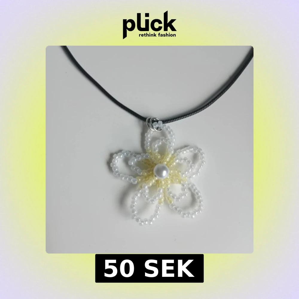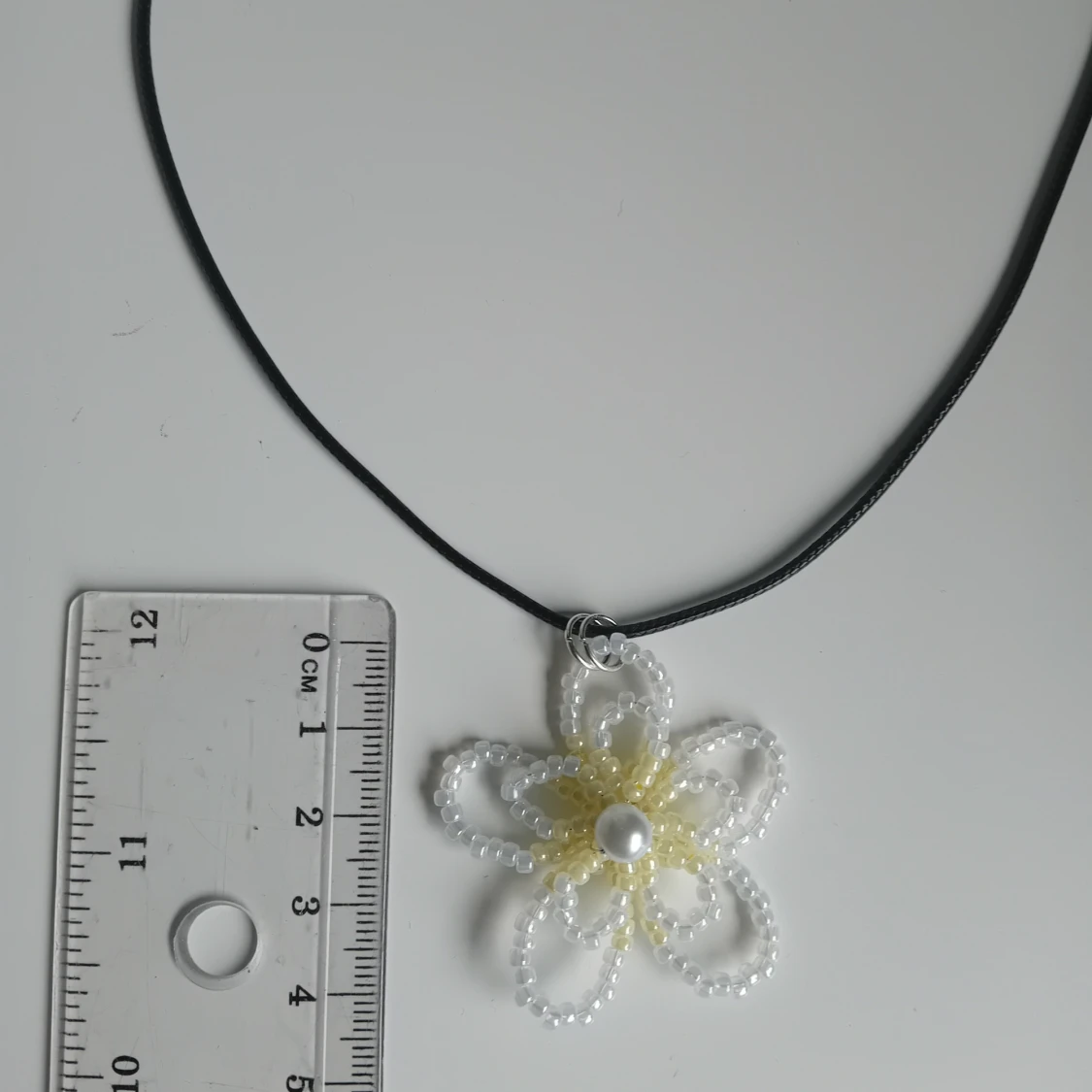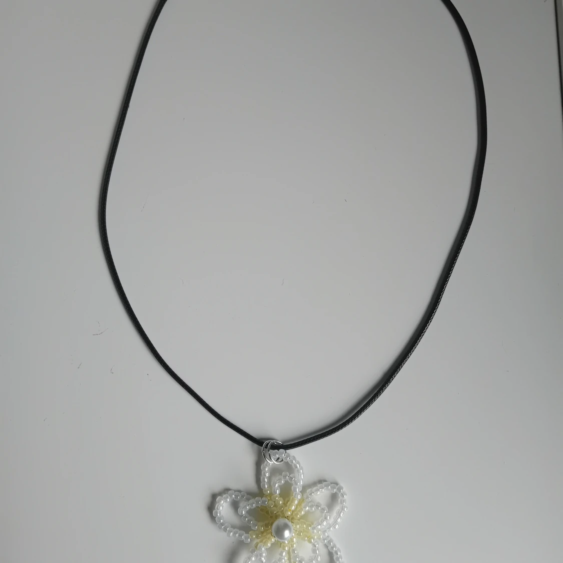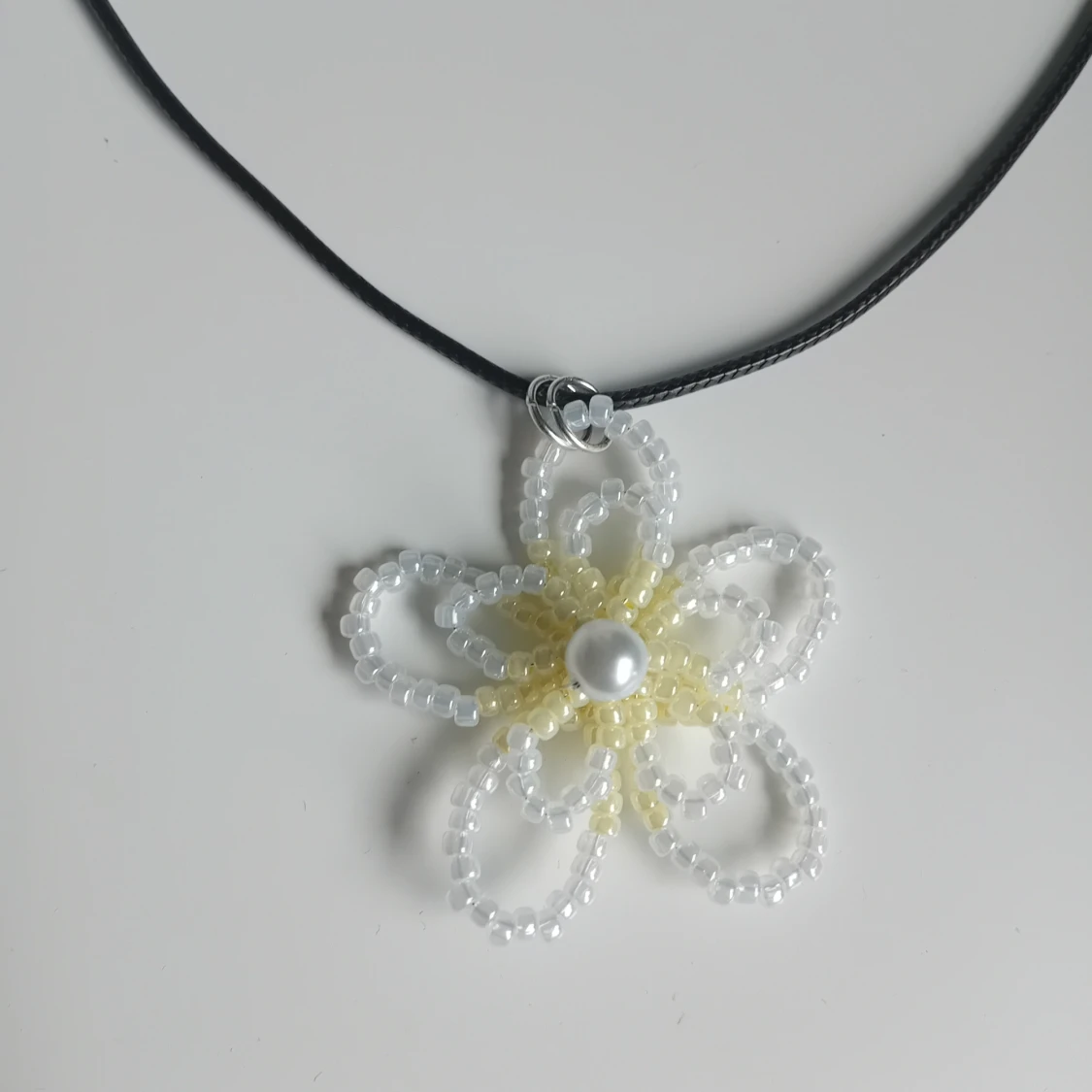 Unikt halsband med en handgjord blomma av små vita och ljusgula pärlor, med en större pärla i mitten.