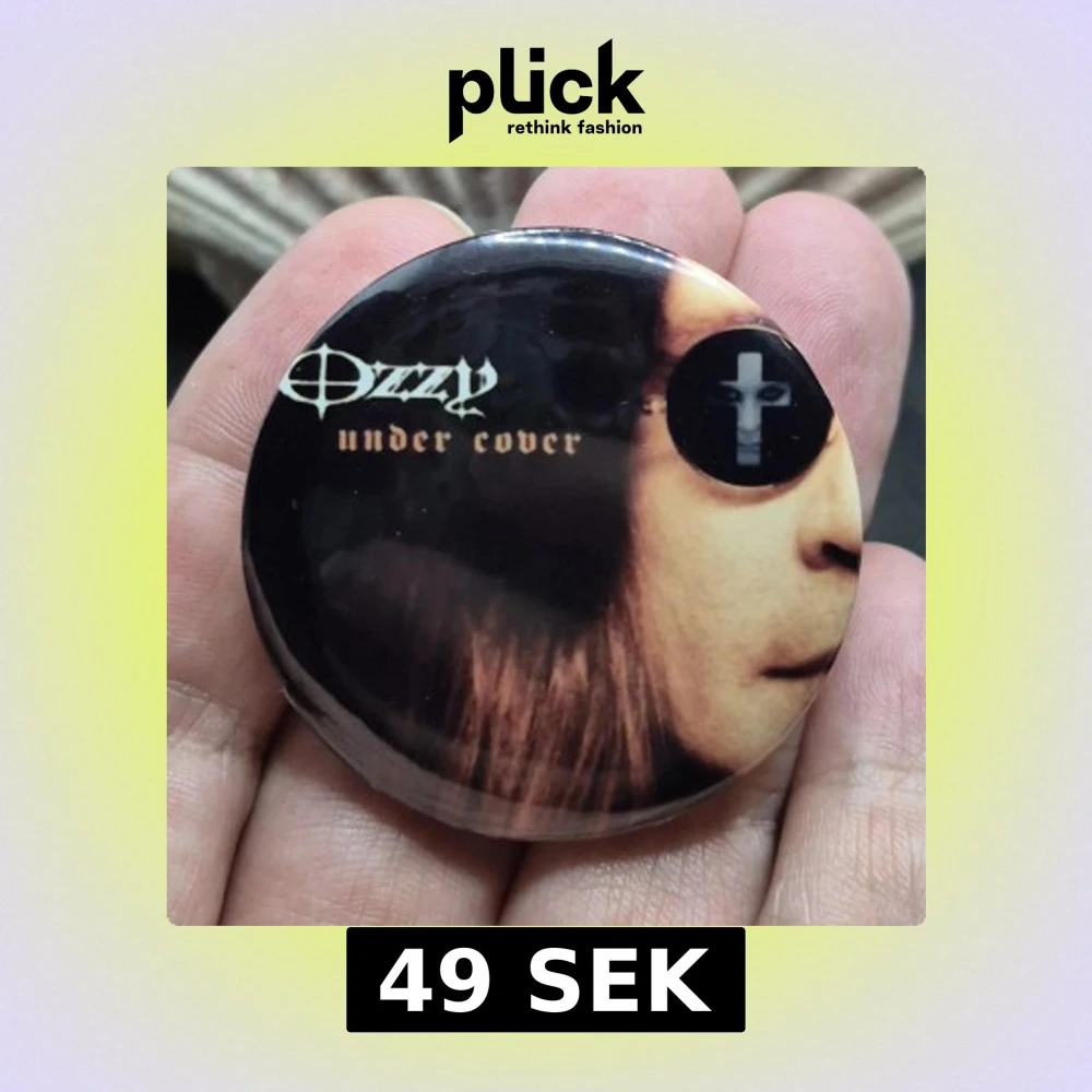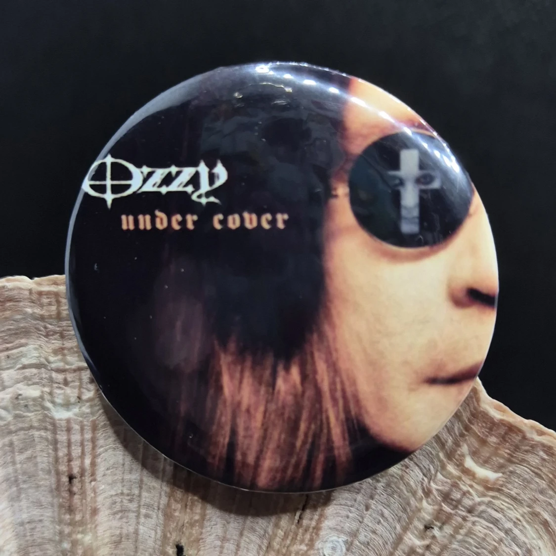 Den här pinsen med bild på Ozzy är ca 4.3 × 4.3 cm. Speglingar på pinsen kan synas på bilderna.