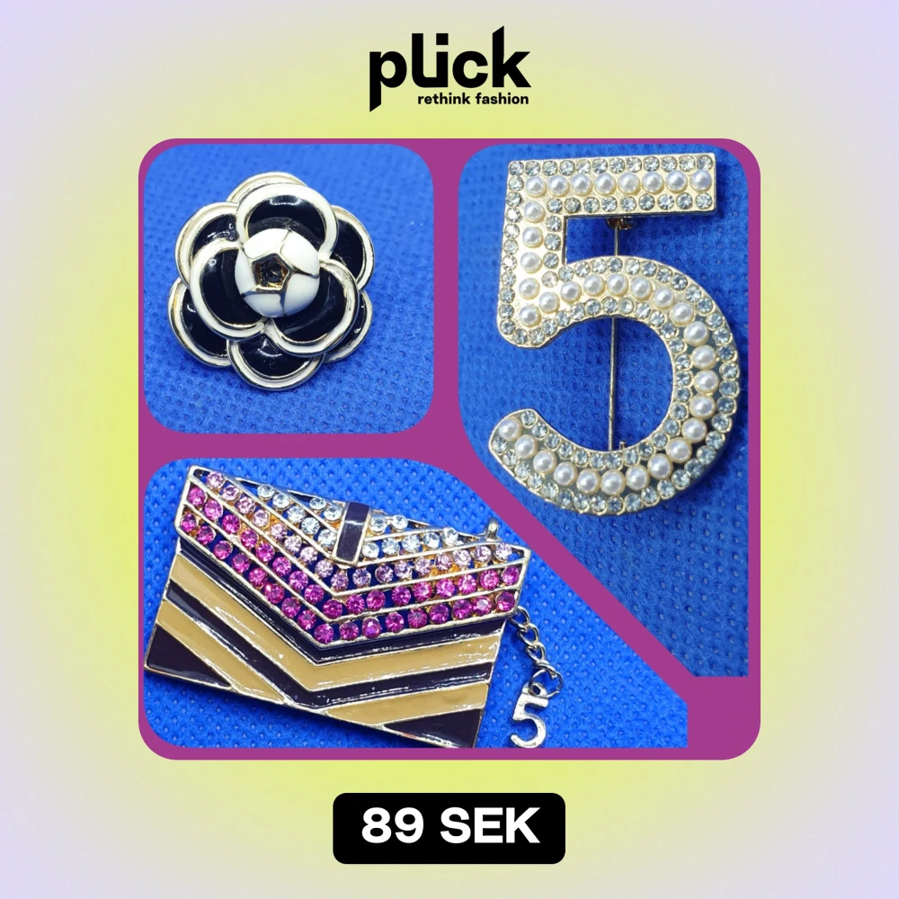 Fashion/Mode broscher, 2 broscher & 1 pin kamelia. Mått väska: 4×2.5cm, nr5: 3.5×2cm, camelia pin: 2.5cm. ✨️✨️✨️Titta igenom alla mina upplagda & köp fler saker i bundle för att spara på frakten & få allt du köpt i ett & samma paket✨️✨️✨️