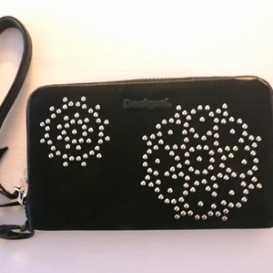 Plånbok i svart mocka . Ett fack utanpå t kort o sedlar . Dragkedja , 2 fack inuti o ett mindre i mitten . Storlek 20*11 cm. Nyskick .