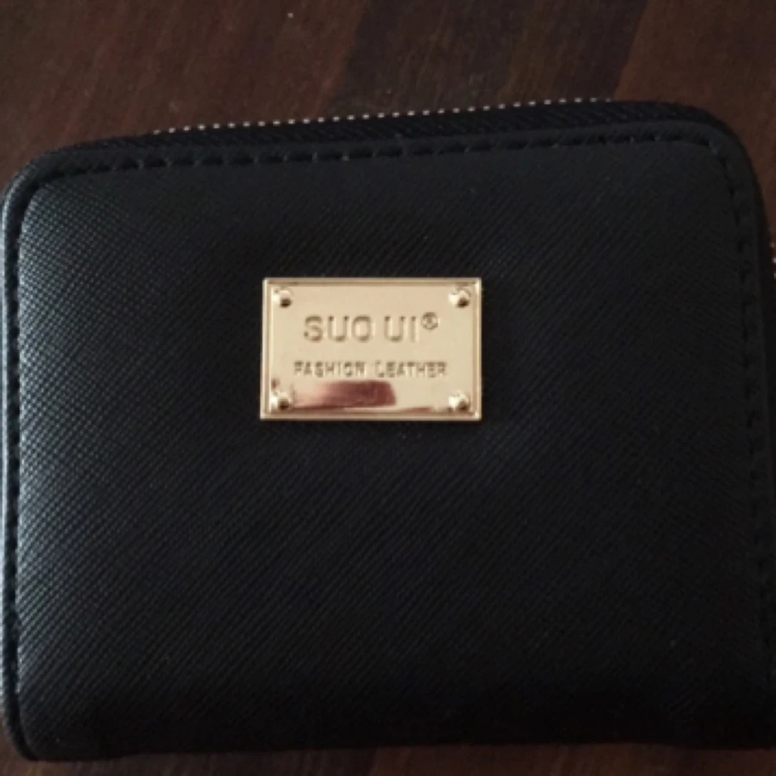 Helt oanvänd plånbok i fuskskinn. Flera fack för kort och ett vit-/rosaprickigt fack för mynt.