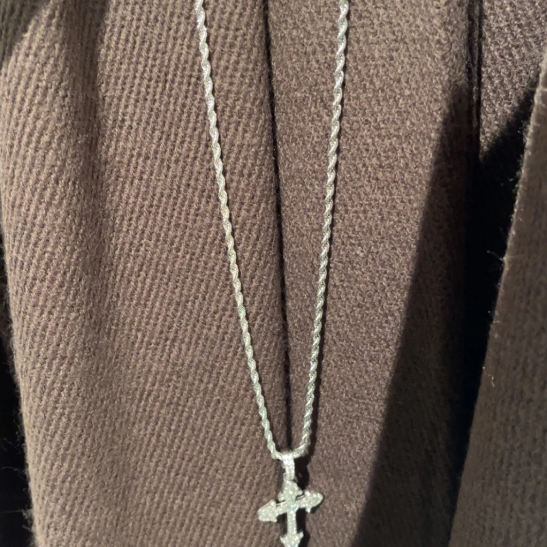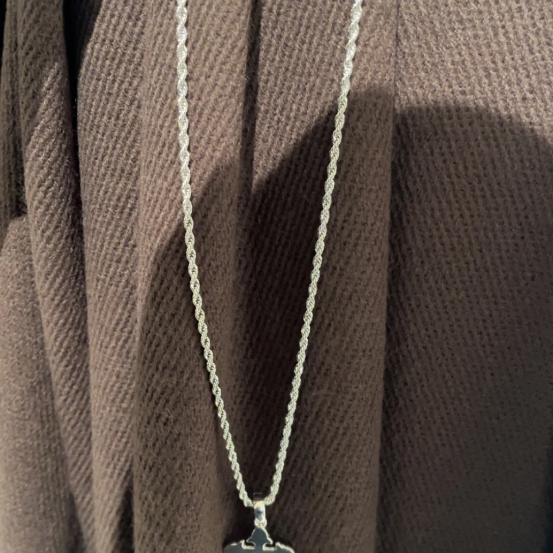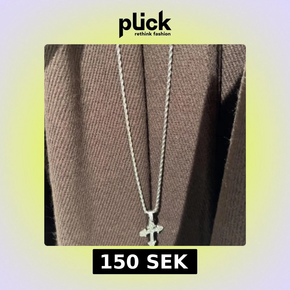 Snyggt halsband i silverfärg med. Kedjan är tvinnad och ger en cool touch, medan hänget har en glittrig yta som gör det extra iögonfallande. Perfekt för dig som gillar unika smycken.