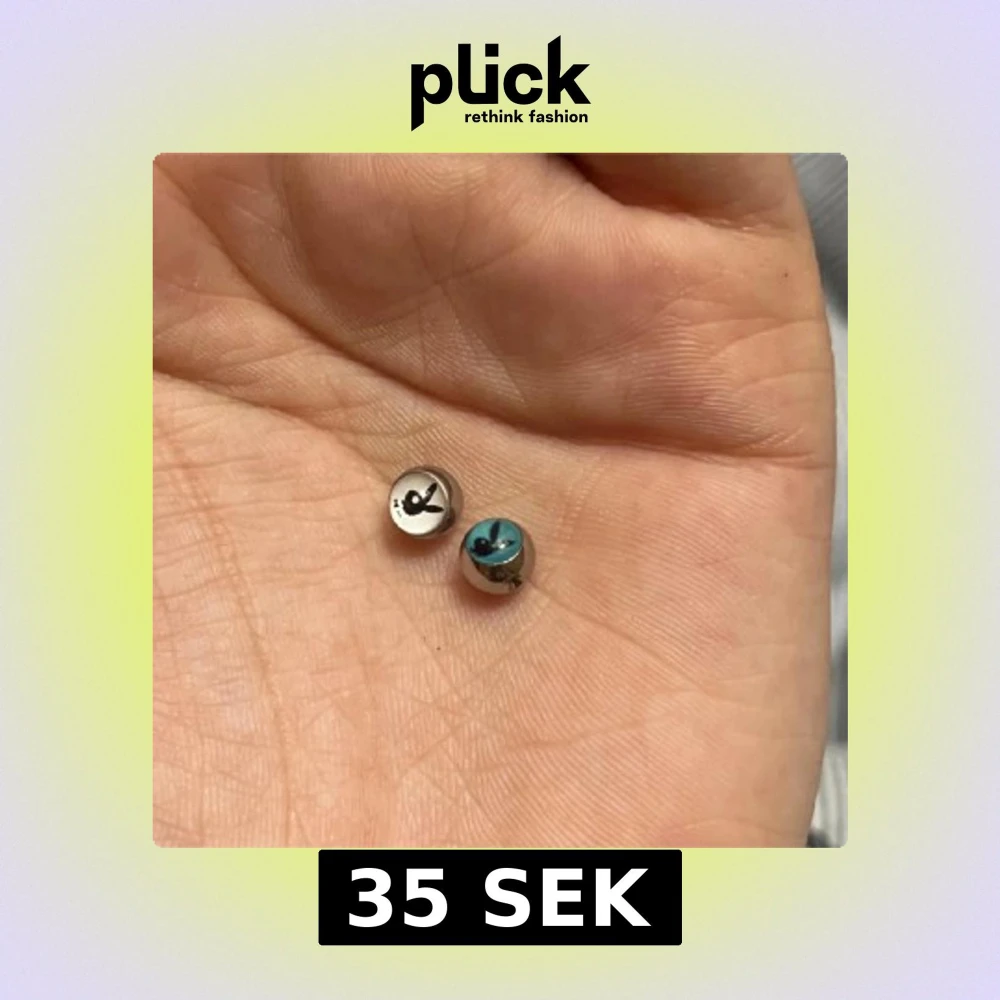 Säljer ett par små, peircing bollar i silver med den ikoniska Playboy-loggan. Ena har en blå bakgrund som ger en fin kontrast. Perfekta för att lägga till en subtil touch av stil. Ej använda!!!! Skickas i en liten påse