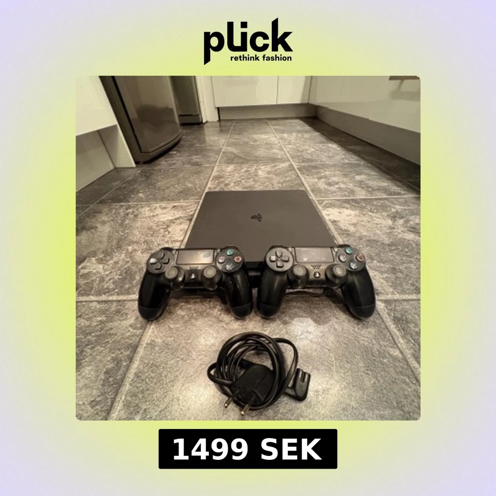 Säljer en PlayStation 4 med två svarta DualShock 4-handkontroller. Konsolen har en stilren design och kommer med nödvändiga kablar. Perfekt för gamingkvällar med vänner! 🎮