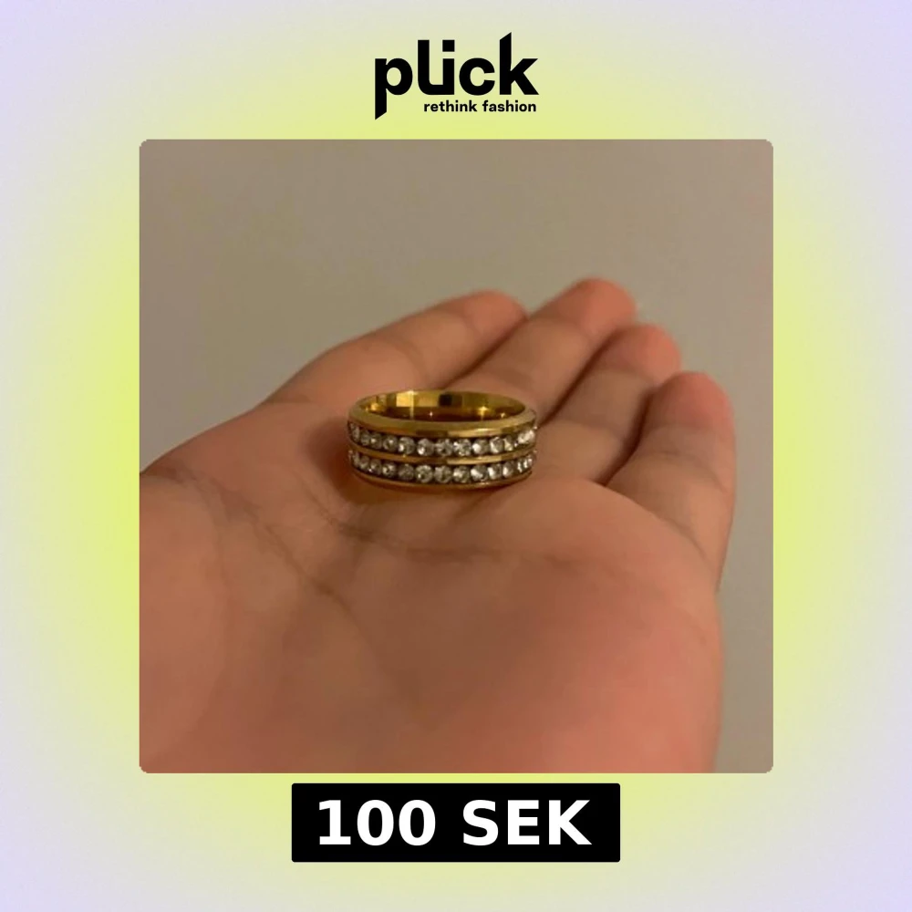 Elegant guldfärgad ring med två rader av glittrande stenar. Perfekt för att ge en touch av glamour till din stil. Ringen är av stål och färgen går inte bort, rostfritt. Storlek kan kanske vara L 18,50