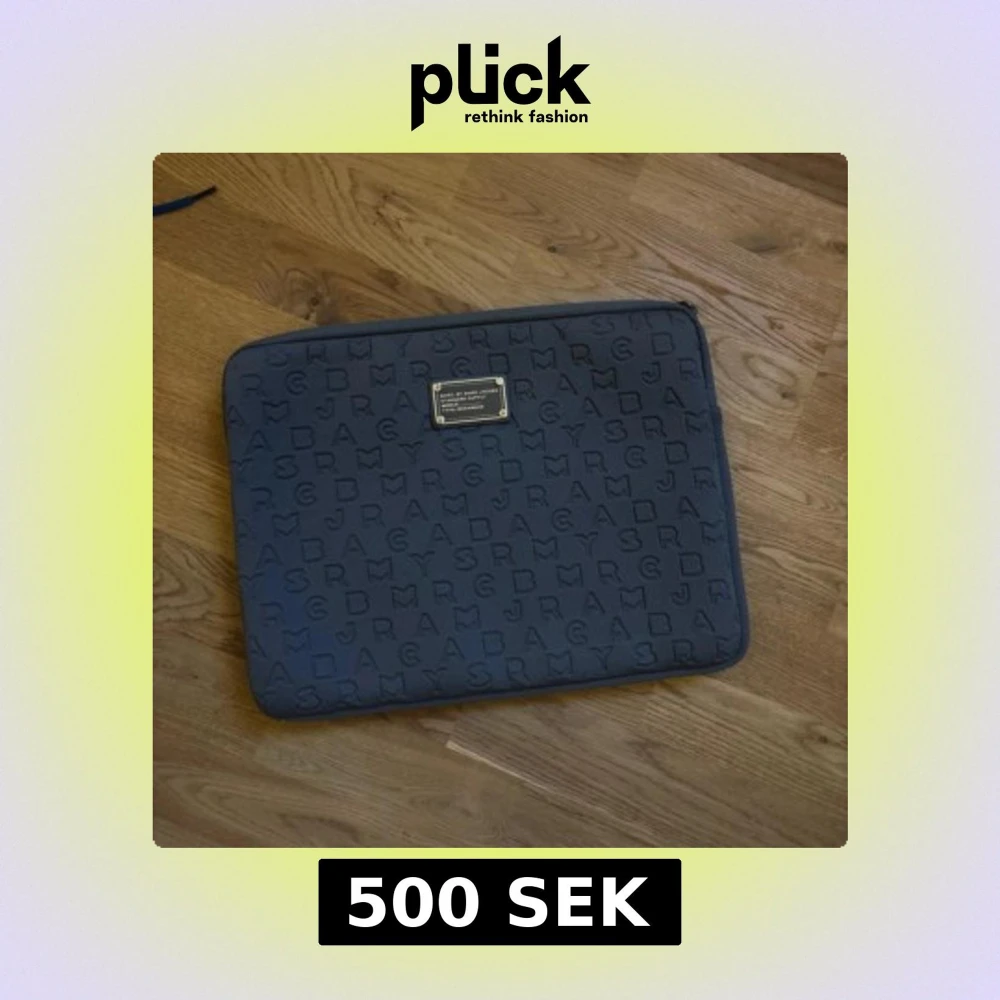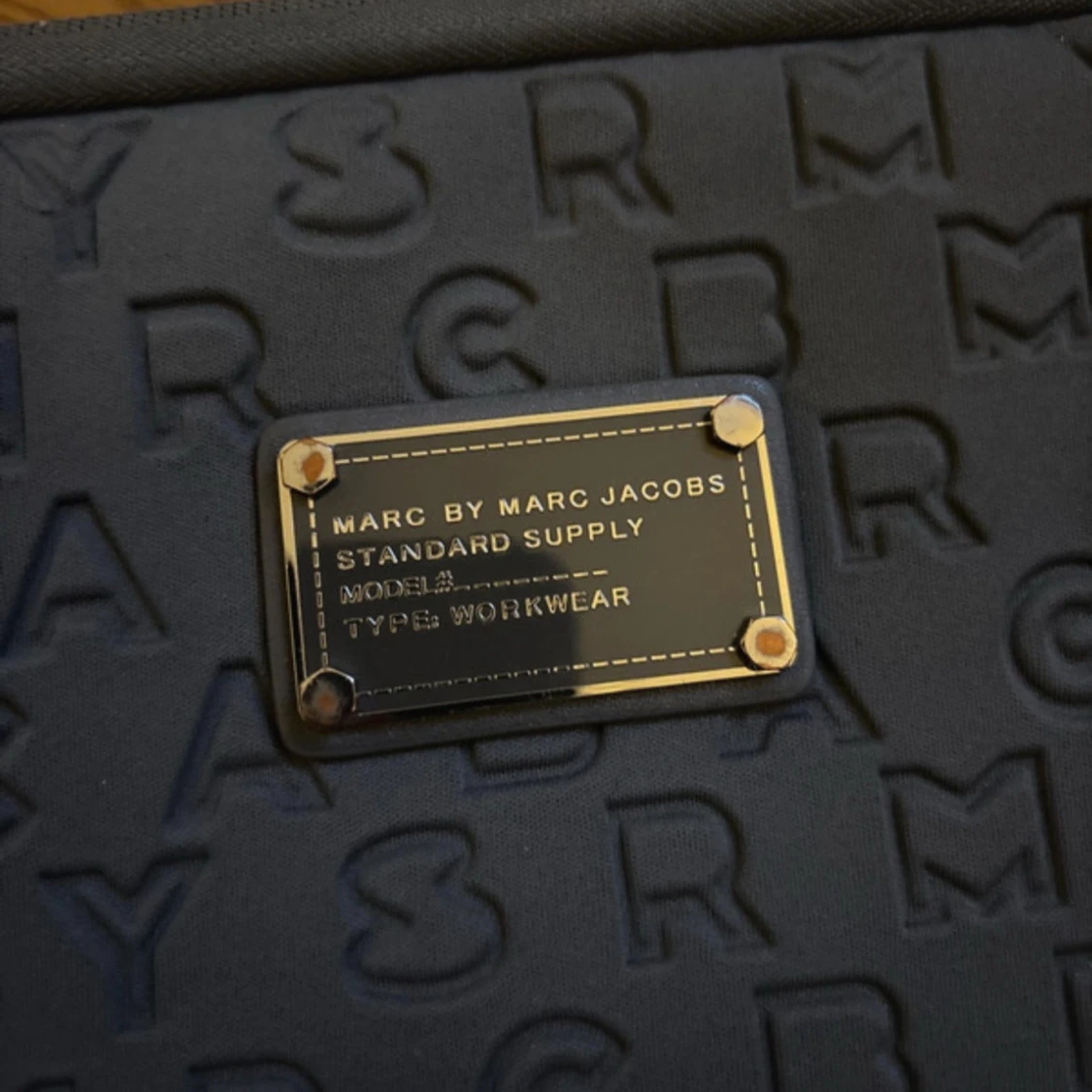 Säljer en snygg datorväska från Marc Jacobs med präglade bokstäver över hela ytan och en metallbricka framtill. Väskan har dragkedja och är fodrad med mjukt material på insidan. Jättefint skick