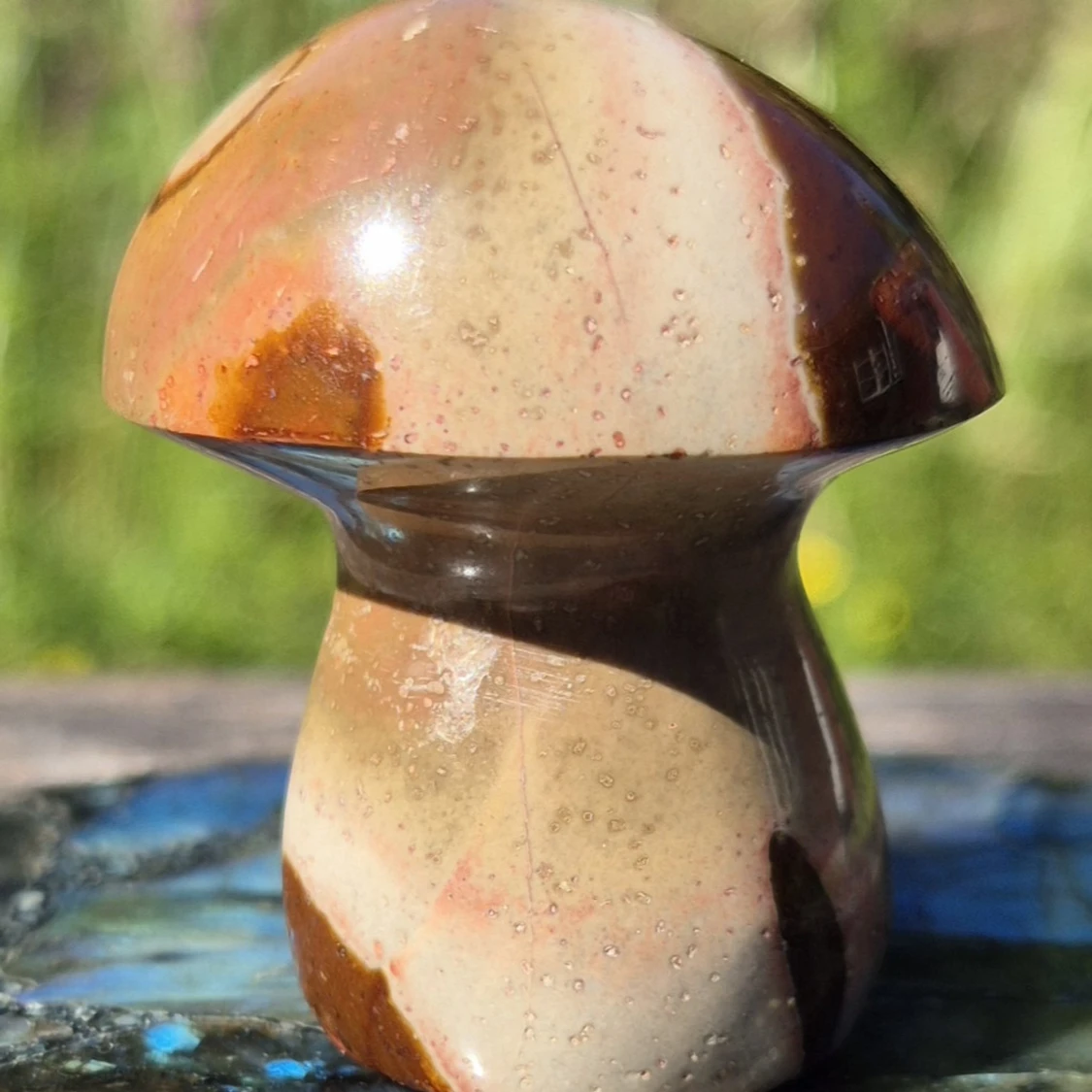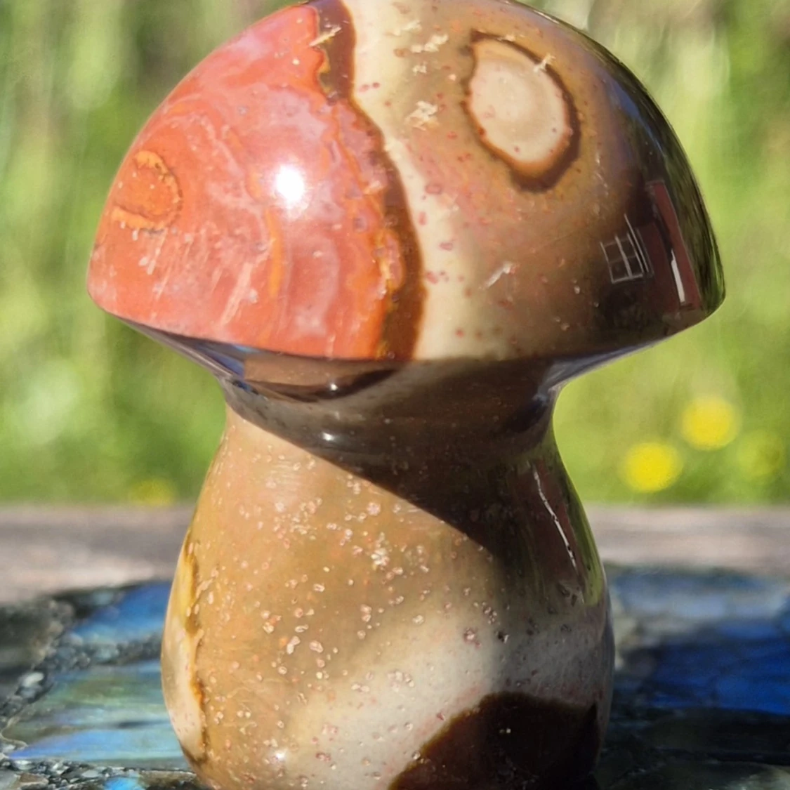 Vackra polykrom jaspis är en mångfärgad & mönstrad sten från Madagaskar, det är en sten som går i jordiga färgblandningar som grön, röd, gul, brun, orange, beige & vit, den har fantastiska mönster som tex ögon, vågor & cirklar Mått på de olika svamparna ses på sista bilden. Varje sten är unik och det är stenen på bilderna som annonsen gäller. Naturliga sprickor kan förekomma. Detta är en sten som förkroppsligar ens sanna jag och hjälper dig att kanalisera dina energier till dina närmaste