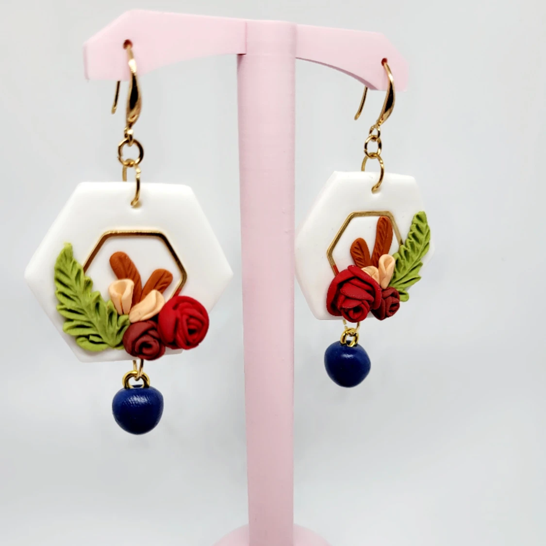 Egengjorda örhängen i polymerlera. Själva hängen är i rostfritt stål och pläterat i guld, nickelfria! Går att byta till plast eller clips om så önskas.