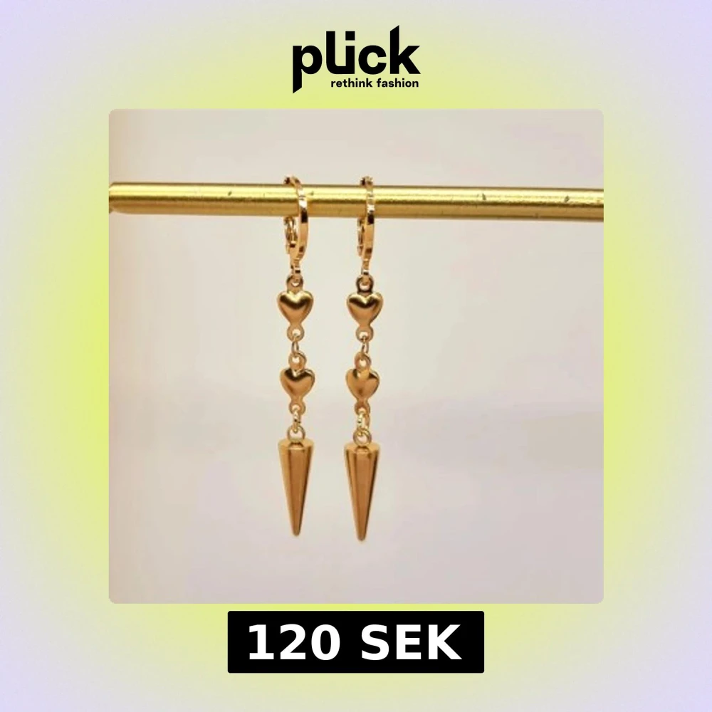 Eleganta guldörhängen med två små hjärtan som leder ner till en spetsig detalj. Perfekta för att ge en romantisk touch till din stil. Lätta att bära och passar till många tillfällen.Handgjorda örhängen●Material-100% rostfritt stål ●Örhängeskrokar -rostfritt stål. Nickel fri. Längd -5cm. Vattentåliga, ändrar inte färgen!