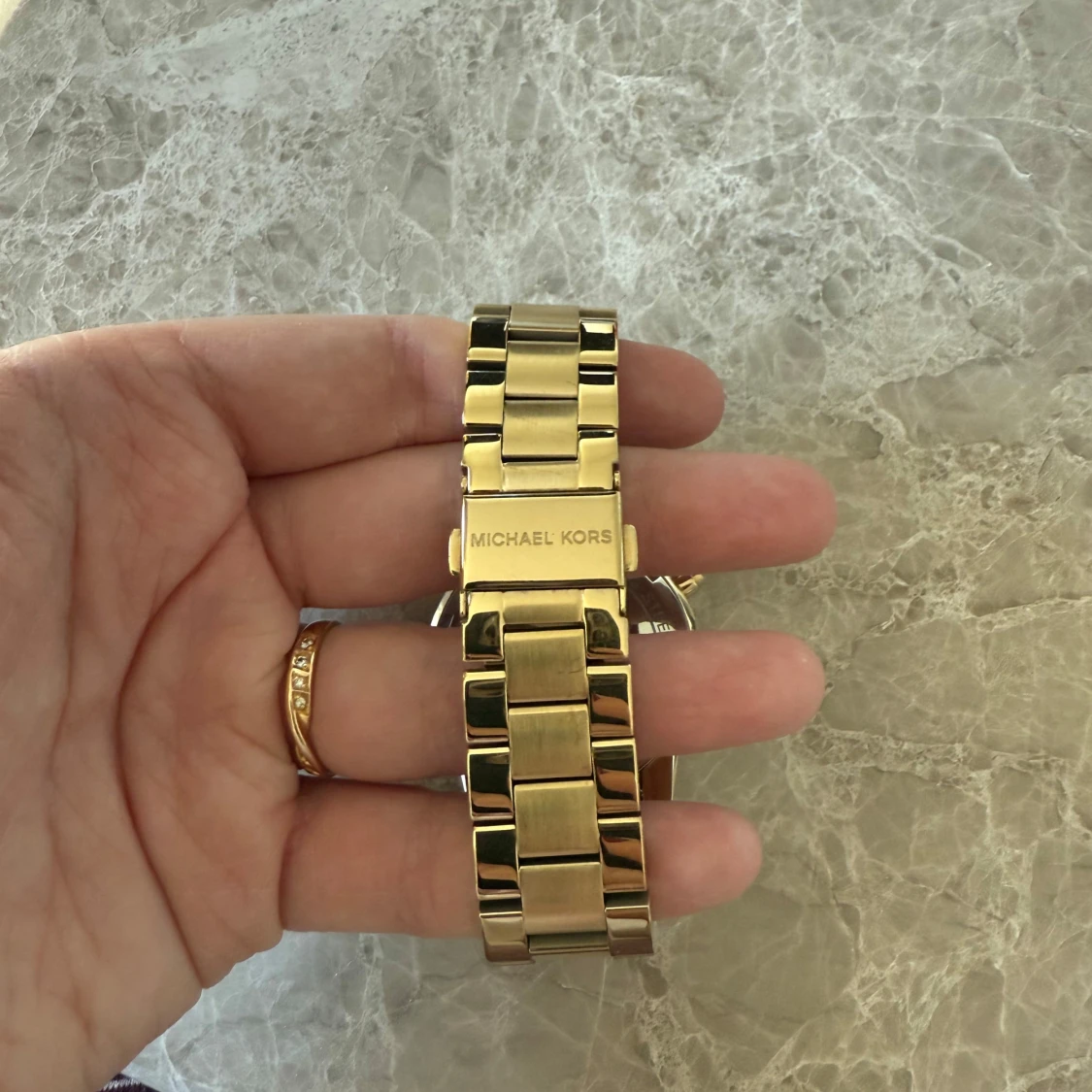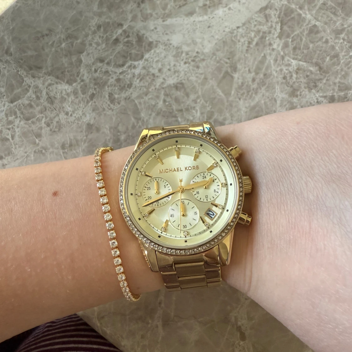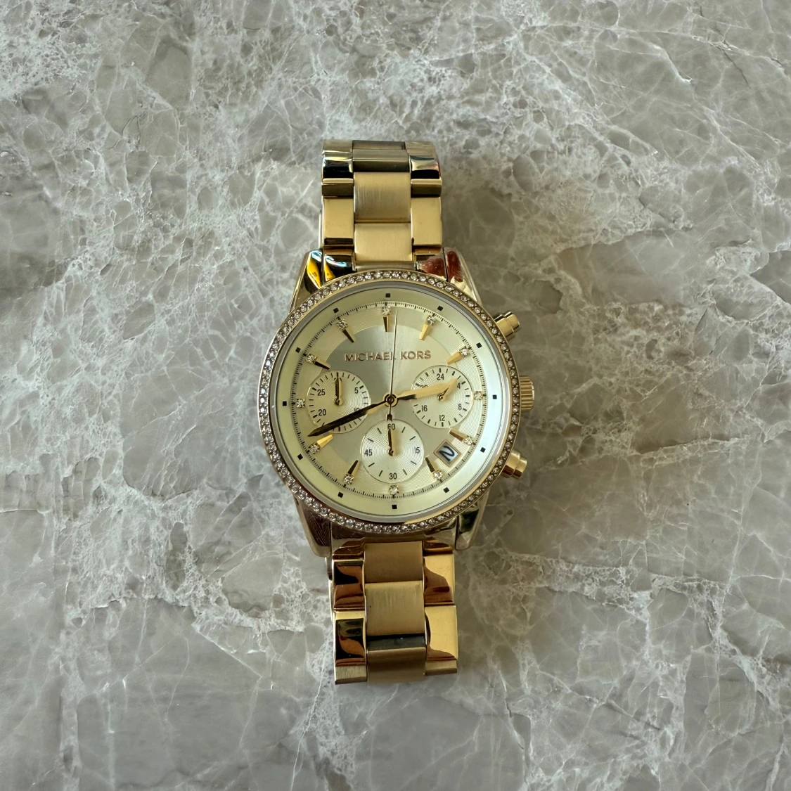 Guld klocka från Michael Kors med diamantkant runt uret. Knappt tecken på användning, nypris 2 695 kr