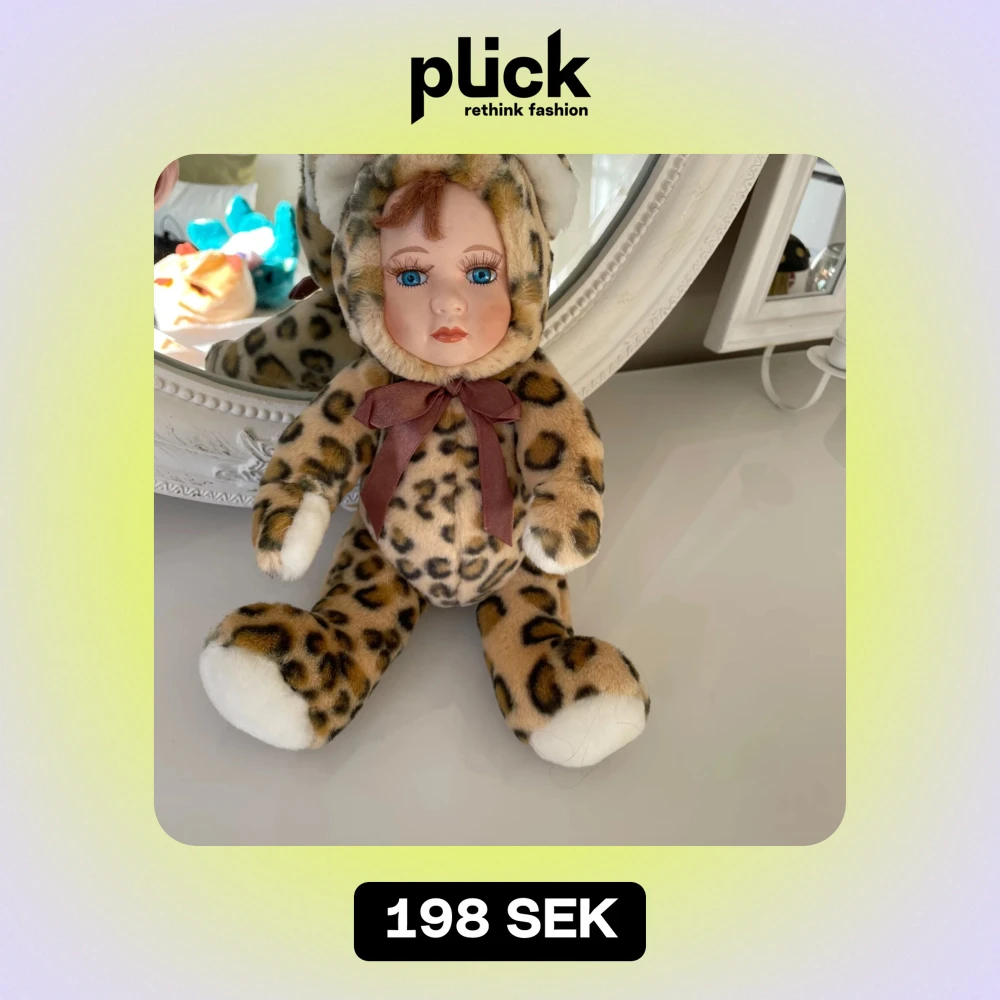Söt vintage docka från år 1988 helt ny klädd i en leopardmönstrad dräkt .armar ,ben är rörliga.. Perfekt som dekoration eller leksak för samlare. Dockan har ansikte är i porslin med ögonfransar, .tvätta i tvättmaskinen 30 grader . Längd:33cm och bred 18cm