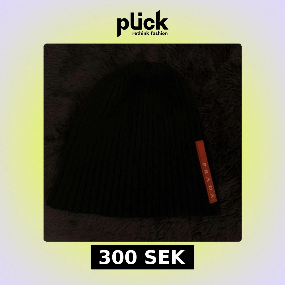 Snygg svart ribbstickad mössa från Prada med röd etikett på sidan där loggan syns tydligt. Mössan har en klassisk form och är perfekt för dig som vill ha en stilren accessoar med lyxig känsla. Passar till både street och chill dagar.
