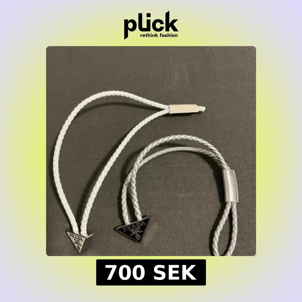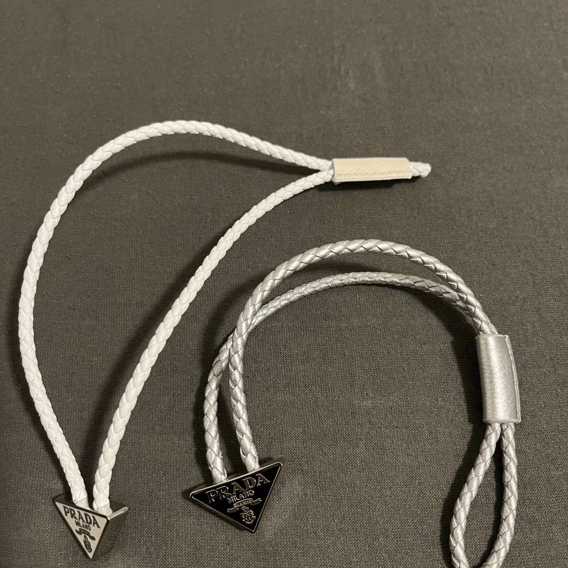 Två stilrena armband från Prada i flätat läder, ett i vitt och ett i silver. Båda har den ikoniska trekantsloggan i metall med texten 'PRADA MILANO'. Perfekt accessoar för att lyfta din outfit med en lyxig touch.