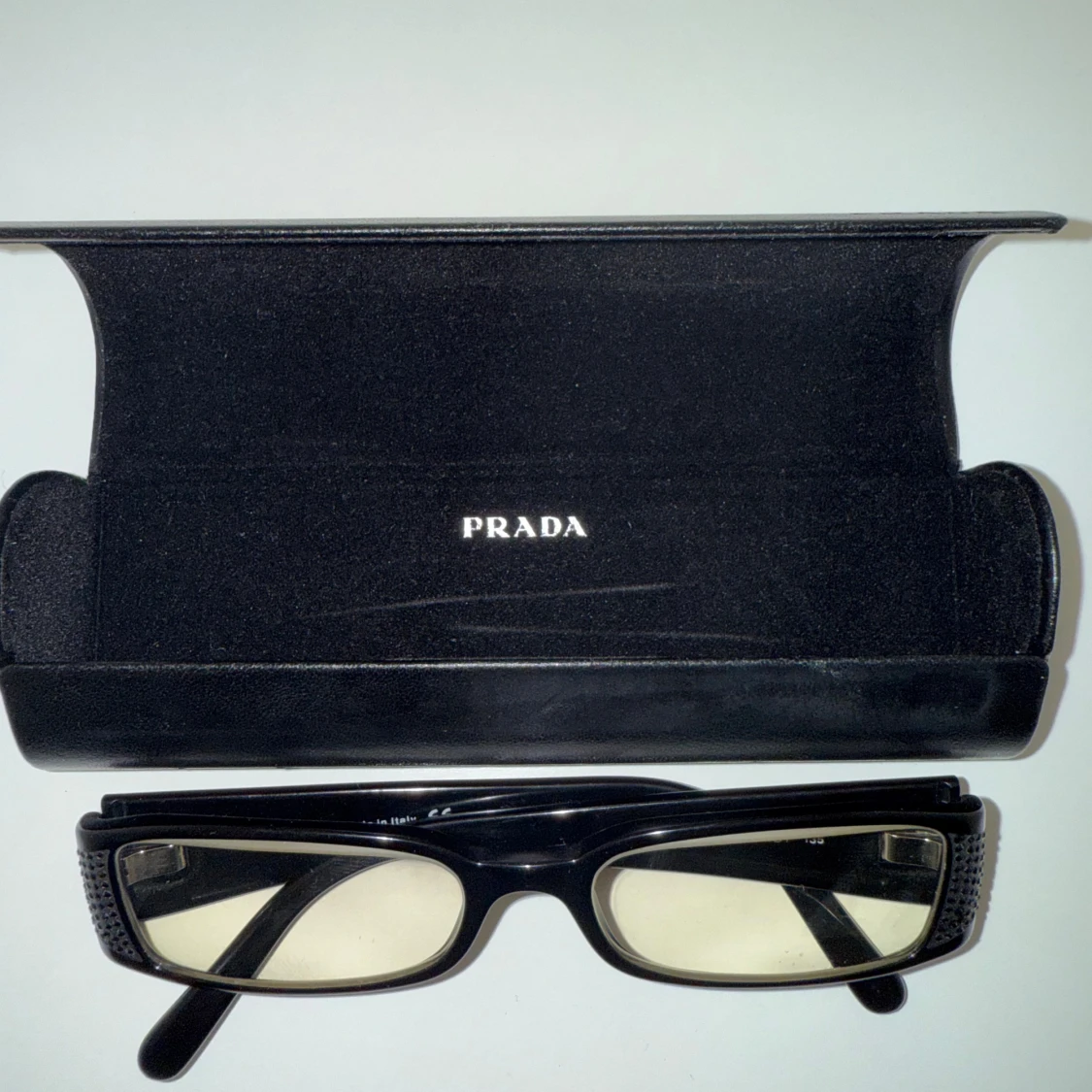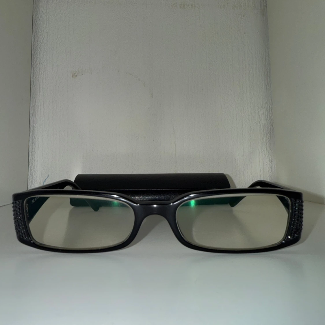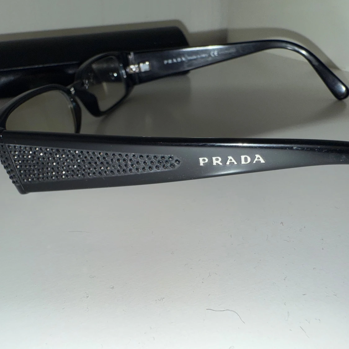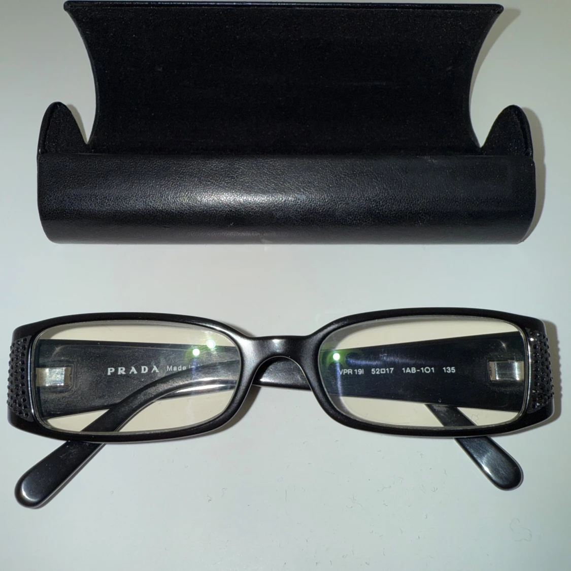 Snygga svarta glasögon från Prada med rektangulär form och coola strassdetaljer på bågens sidor. Modellen är VPR 19I och de kommer med originalfodral. Perfekt för dig som vill ha en stilren och lyxig look med lite extra bling. Öppen för prisförslag och kan diskuteras! :)