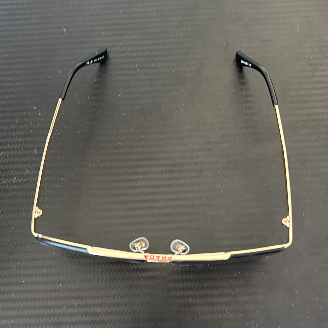 Snygga solglasögon från Prada med fyrkantiga svarta linser och tunn guldfärgad metallbåge. Sidorna har diskret röd Prada-logga och svarta skalmar. Modern och stilren design som ger en lyxig vibe till din look.