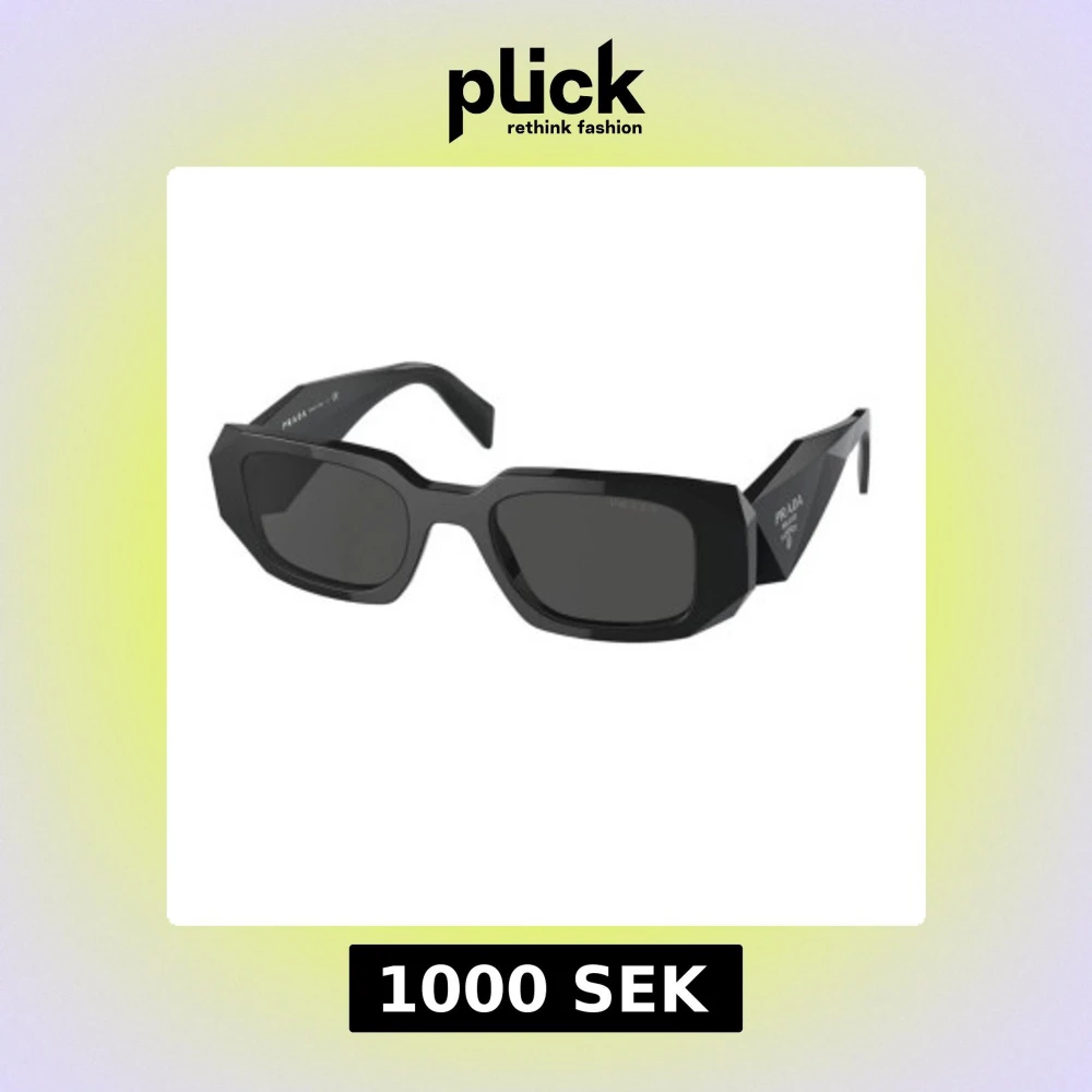Säljer ett par svarta solglasögon från Prada med rektangulär form och breda skalmar. Glasögonen har en cool, kantig design och logotypen syns på sidan. Perfekt för dig som vill ha en statement-accessoar med lyxig vibe. Använd några gånger, fodral och kvitto finns!