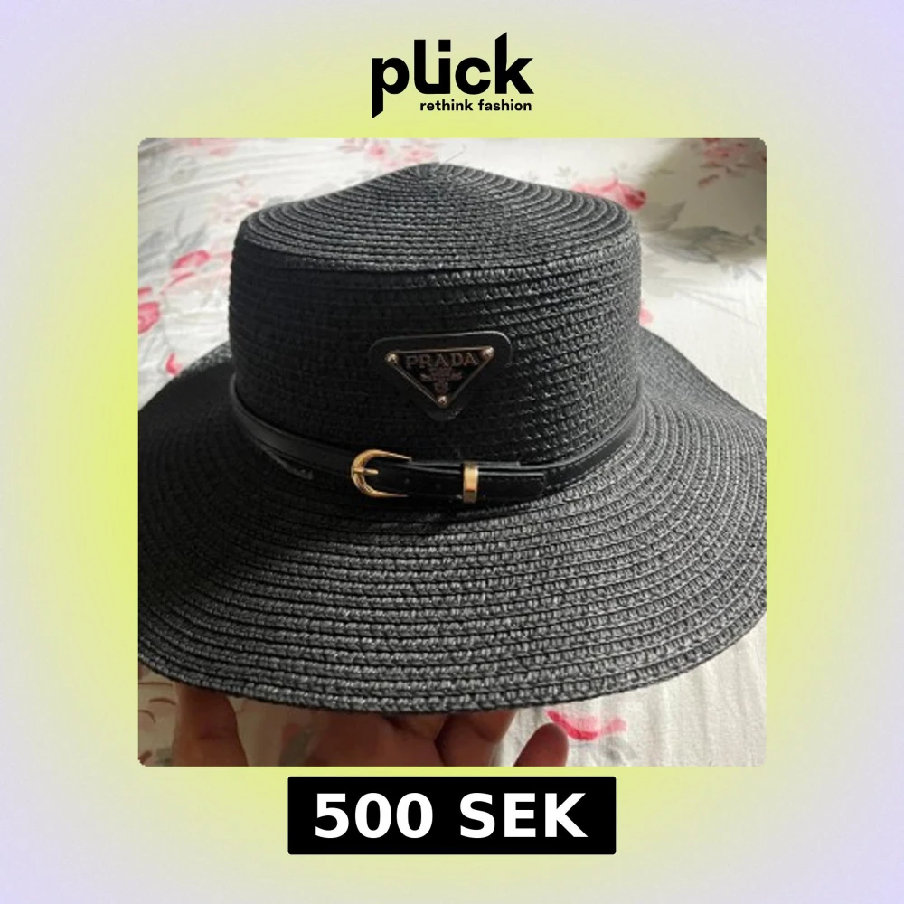 Snygg svart stråhatt från Prada med klassisk bred brätte och dekorativt svart läderband med guldfärgat spänne. Hatten har Pradas ikoniska metallogo framtill och är perfekt för en trendig look under soliga dagar.