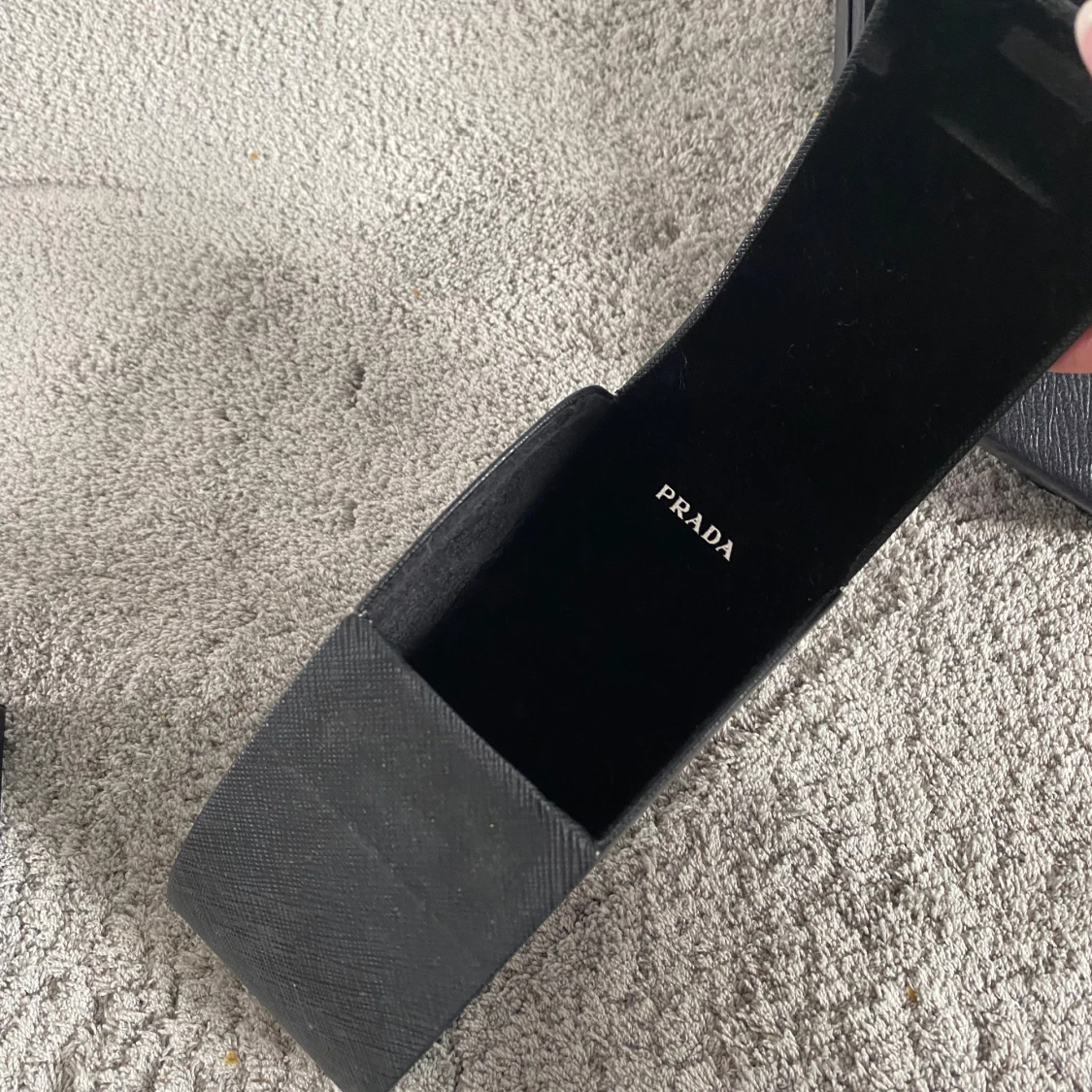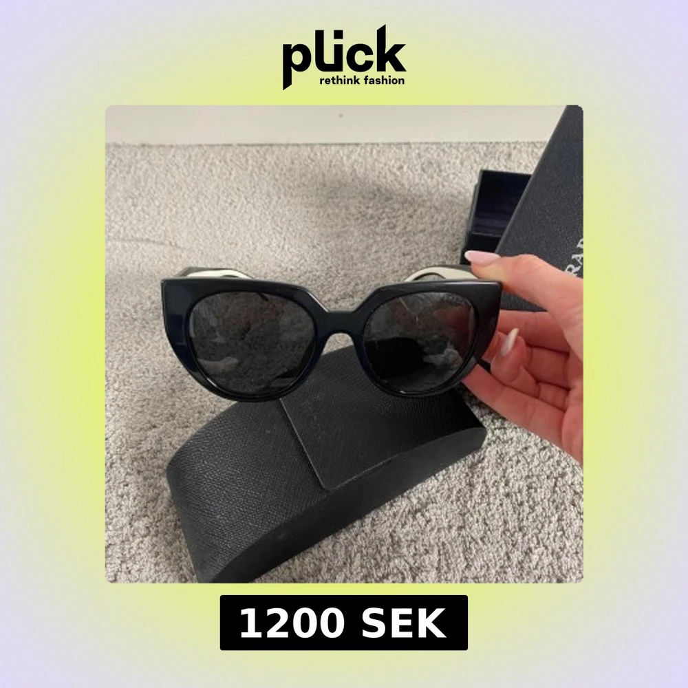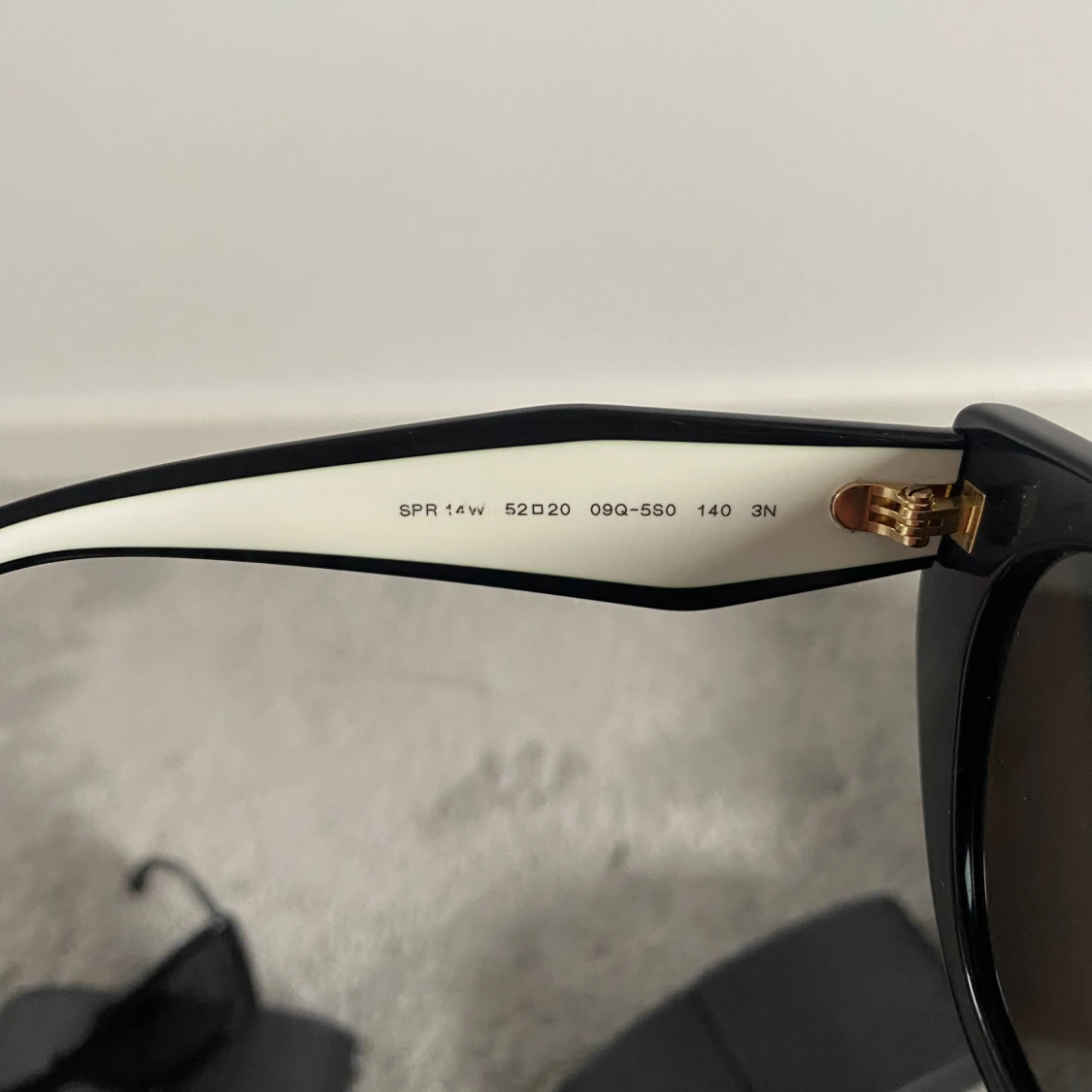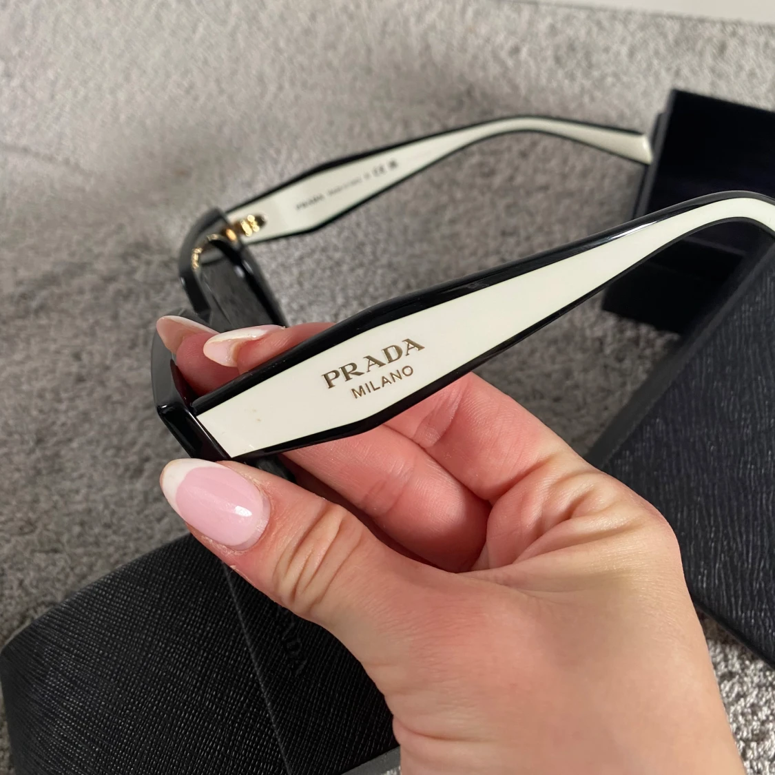 Snygga svarta cat eye solglasögon från Prada med breda skalmar i svart och vitt och gulddetaljer vid gångjärnen. Klassisk och trendig design med tydlig Prada-logga på sidan. Kommer med originalfodral och box.