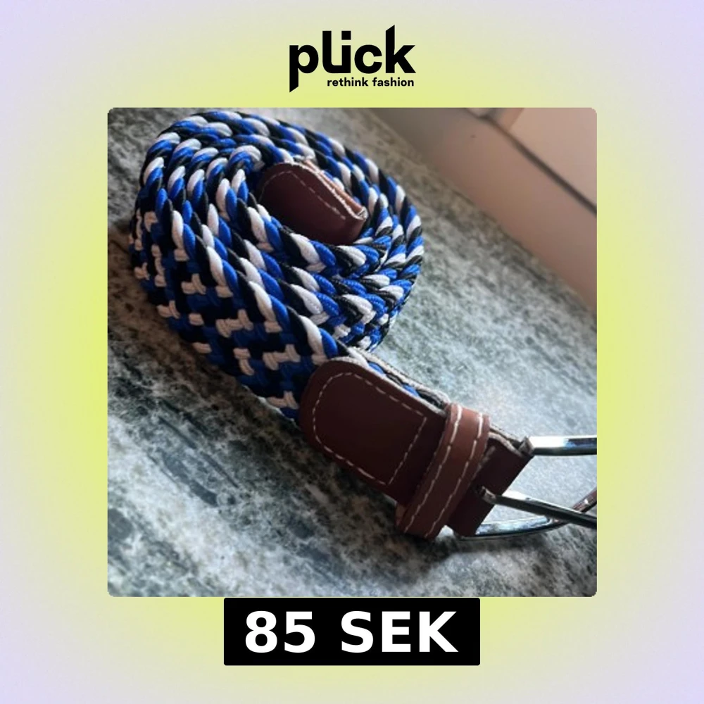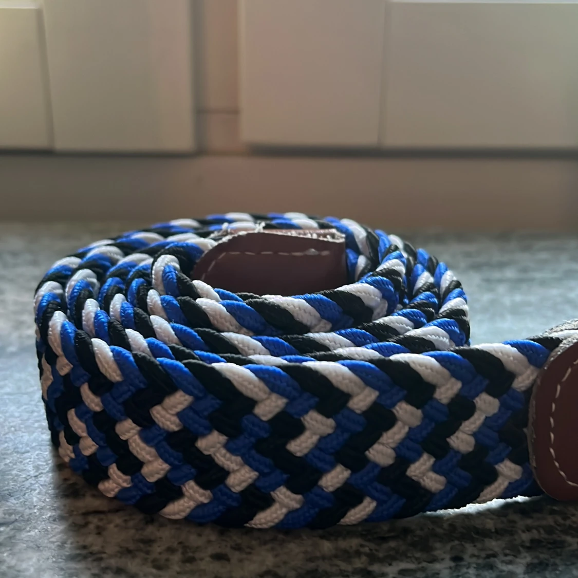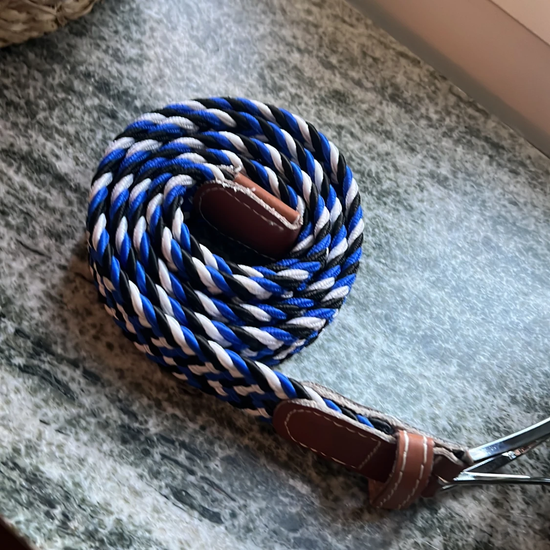 Snyggt flätat bälte med randigt mönster i blått, vitt och svart. Bältet har detaljer i brunt skinn och ett silvrigt spänne. Perfekt accessoar för att lyfta din outfit med lite färg och stil.