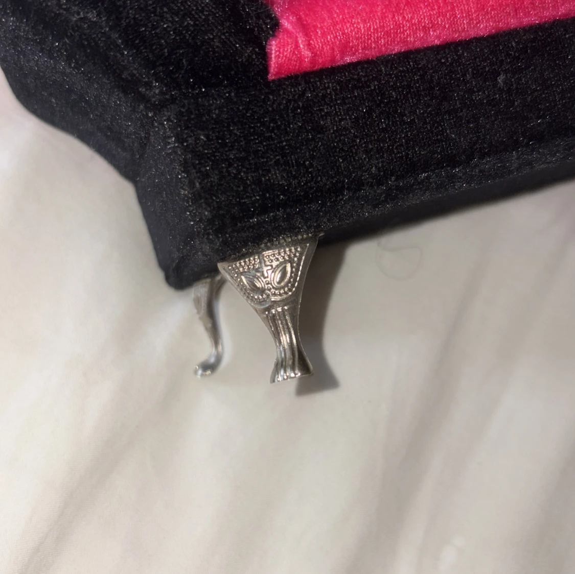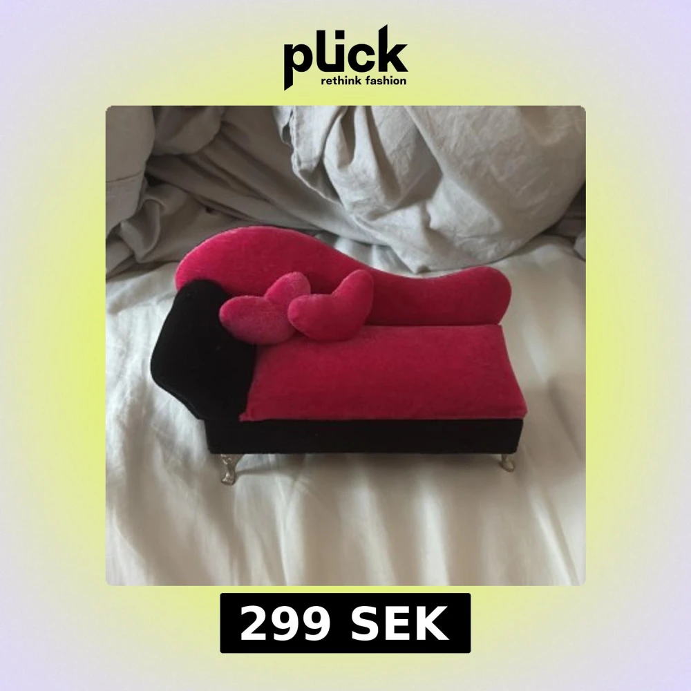 Supergulligt smyckeskrin som ser ut som en liten soffa i rosa och svart sammet, med två hjärtformade kuddar och silvriga ben. Inuti finns spegel och fack för ringar och andra smycken. Perfekt för att förvara dina favoritsmycken på ett unikt sätt. Den är slutsåld överallt å jag sänker priset vid snabb affär då vi är under en flytt❤️