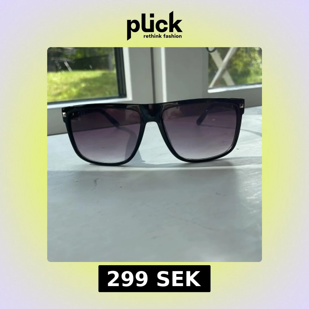 Snygga svarta solglasögon med breda bågar och fyrkantig form. Glasen är tonade i mörkgrått och bågarna har små silvriga nitar vid hörnen för extra detalj. Perfekt accessoar för att höja din stil på sommaren. Nästan exakt lika som ray bans.