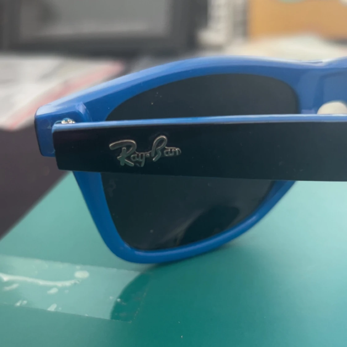 Snygga Ray-Ban Wayfarer solglasögon med blå bågar och svarta skalmar. Glasen är mörka och har en klassisk fyrkantig form. Perfekt för dig som vill sticka ut med en cool färgkombo och ikonisk design. Ray-Ban-loggan i silver på sidan ger extra stilpoäng.