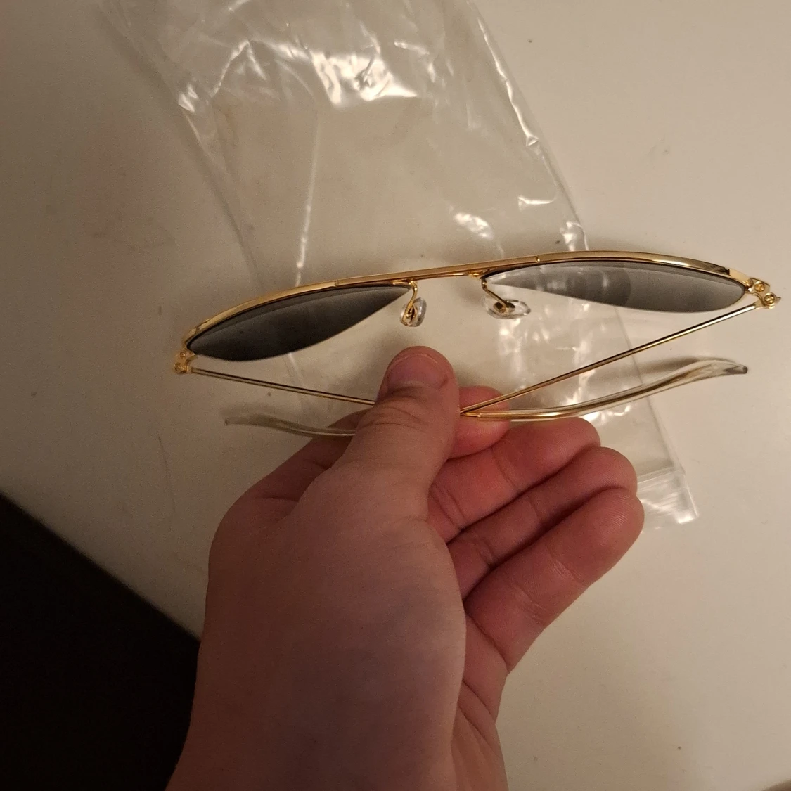 Snygga Ray-Ban aviator solglasögon med tunna guldfärgade metallbågar och mörka linser. Klassisk pilotform som ger en tidlös vibe och passar till de flesta outfits. Ray-Ban-logga syns på linsen. Perfekta för soliga dagar.