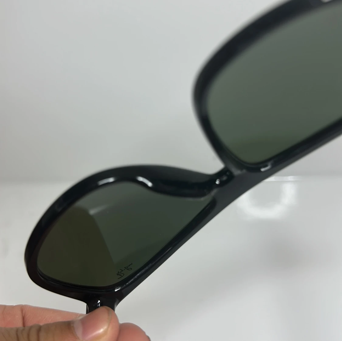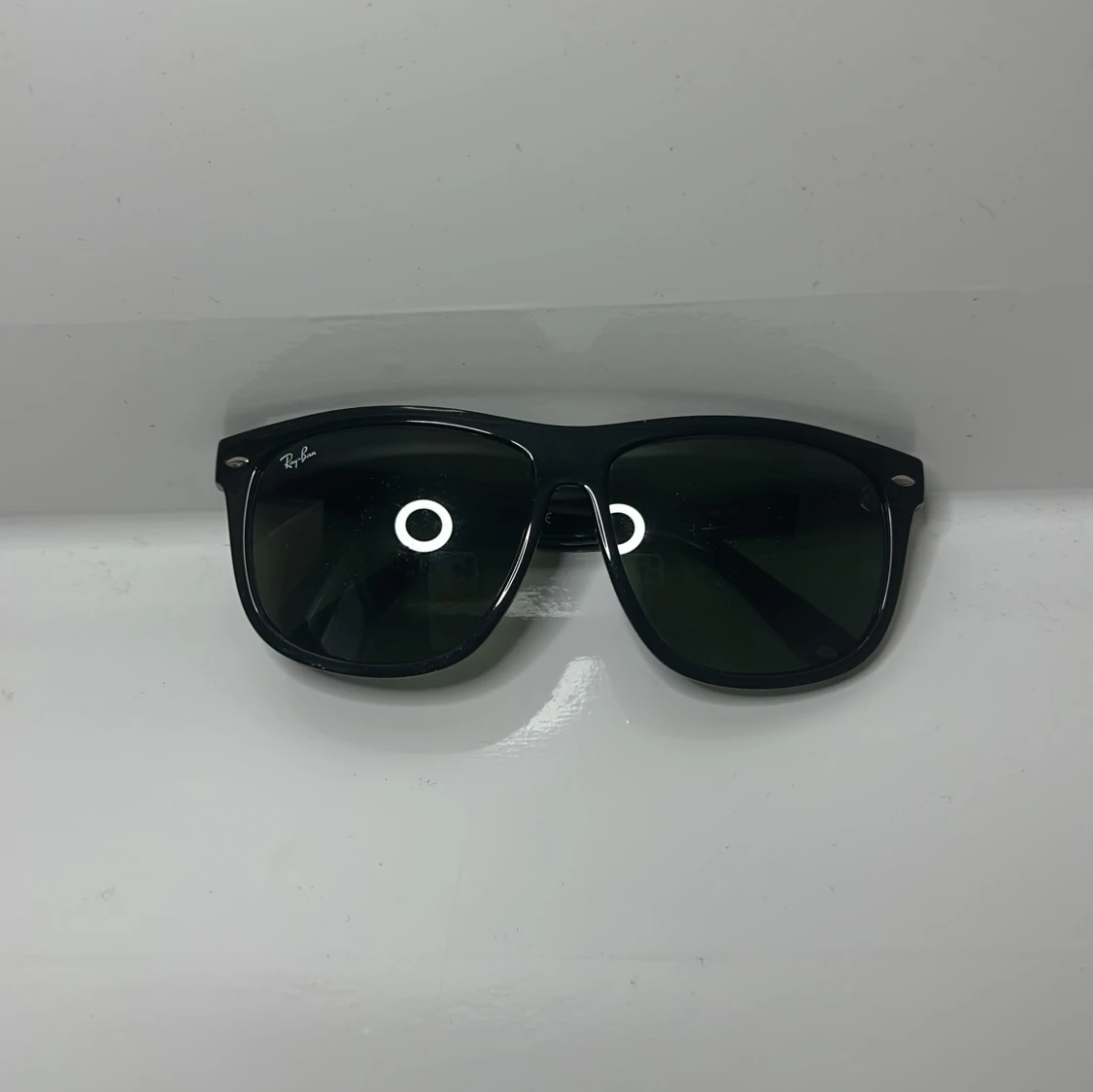 Klassiska svarta solglasögon från Ray-Ban med rektangulära bågar och mörka glas. Snygg och tidlös design med diskret logga på linsen. Bågarna är i plast och passar perfekt för dig som vill ha en stilren accessoar.