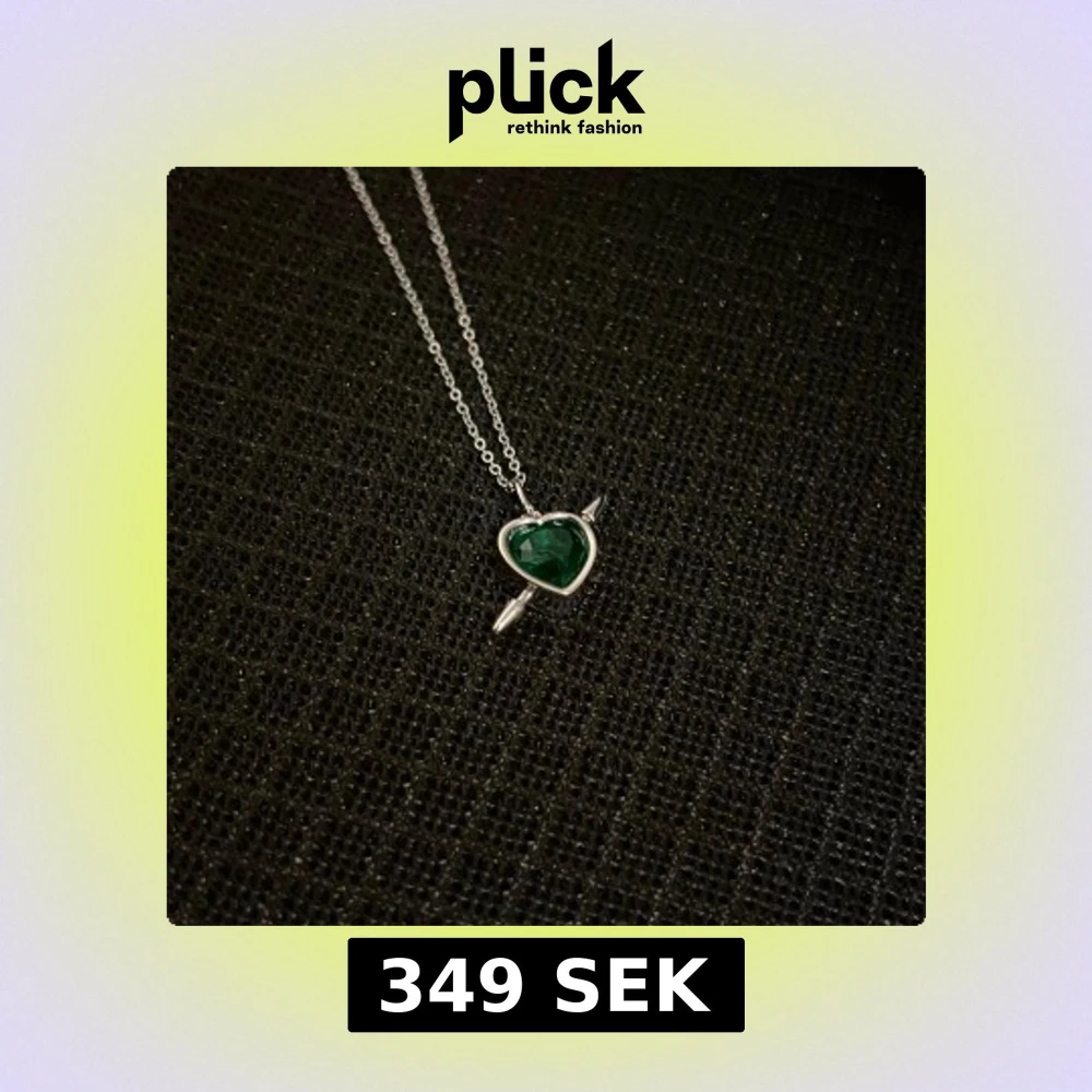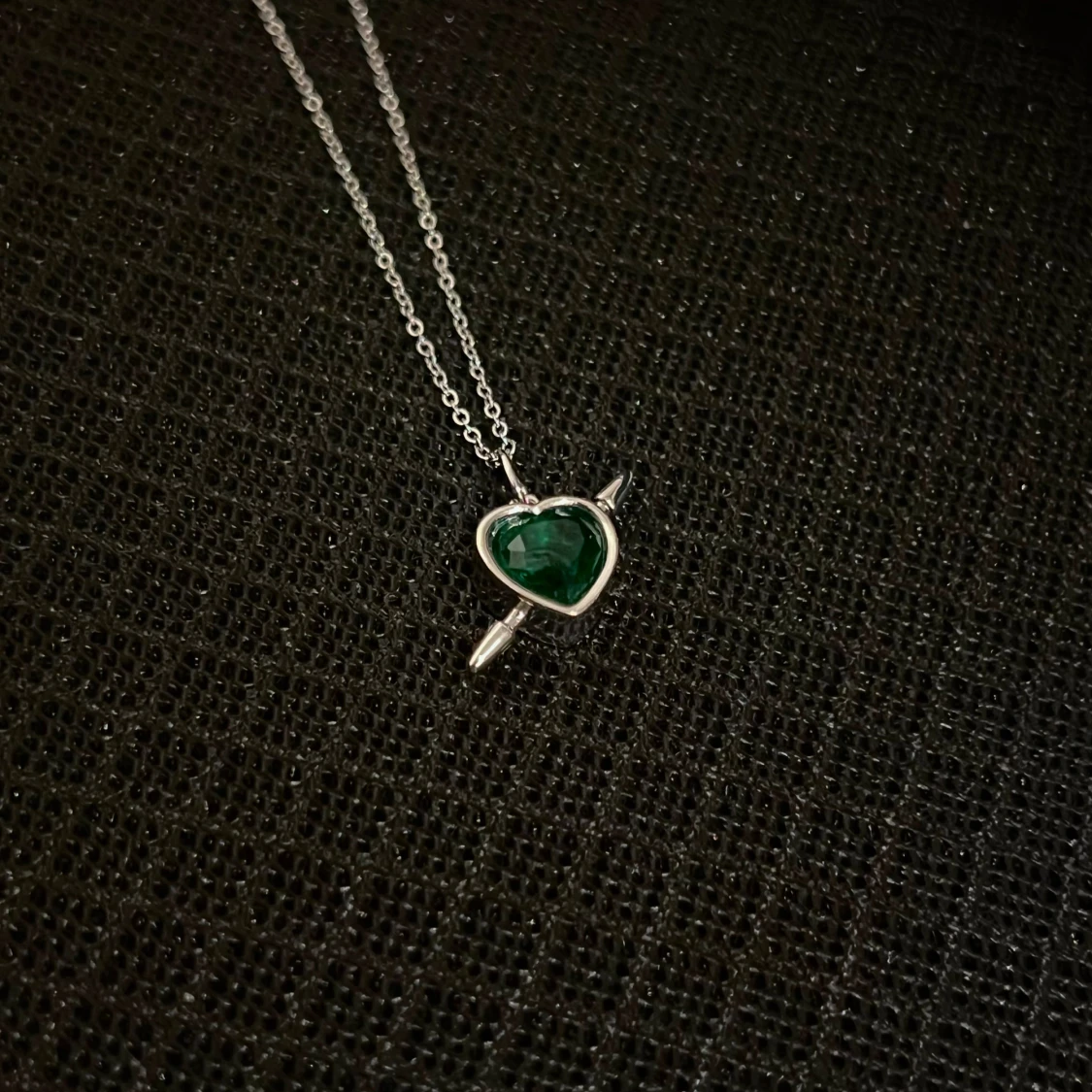 Silver pendant necklace showcasing a heart pierced by an arrow and set with a vivid green stone. Adjustable 50 cm chain, rust- and nickel-free.
