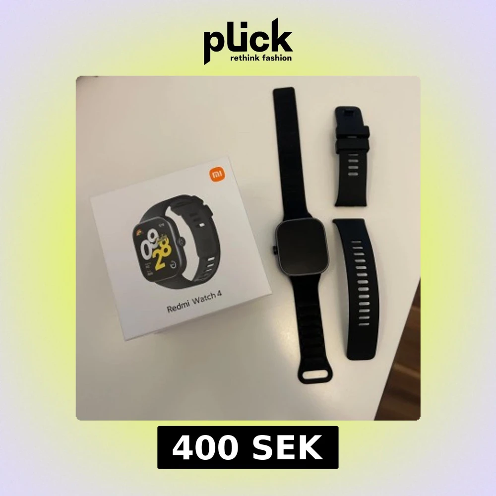 Snygg svart Redmi Watch 4 med fyrkantig display och silikonarmband. Klockan har en modern design med tydlig skärm och medföljande extra armband. Perfekt för dig som gillar teknik och vill ha koll på din vardag direkt på handleden.