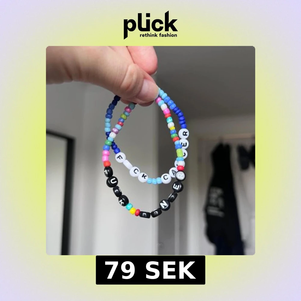Två handgjorda armband med färgglada plastpärlor och bokstavspärlor som bildar texten 'FUCK CANCER'. Ena armbandet har vita bokstavspärlor, det andra svarta. Perfekt statement-accessoar med mix av blå, rosa, gröna och röda pärlor. Önskar du veta exakta mått? Tveka inte att höra av dig!