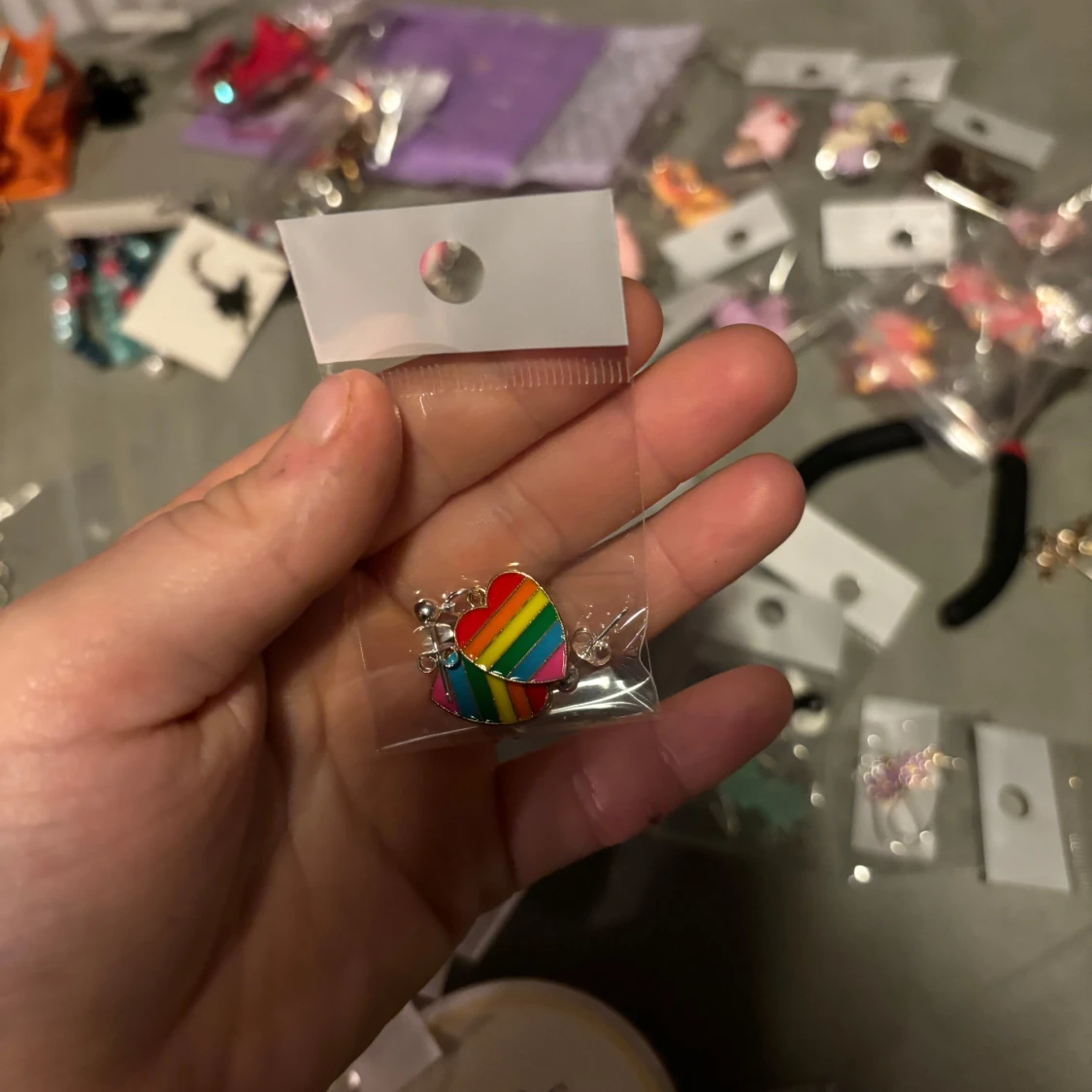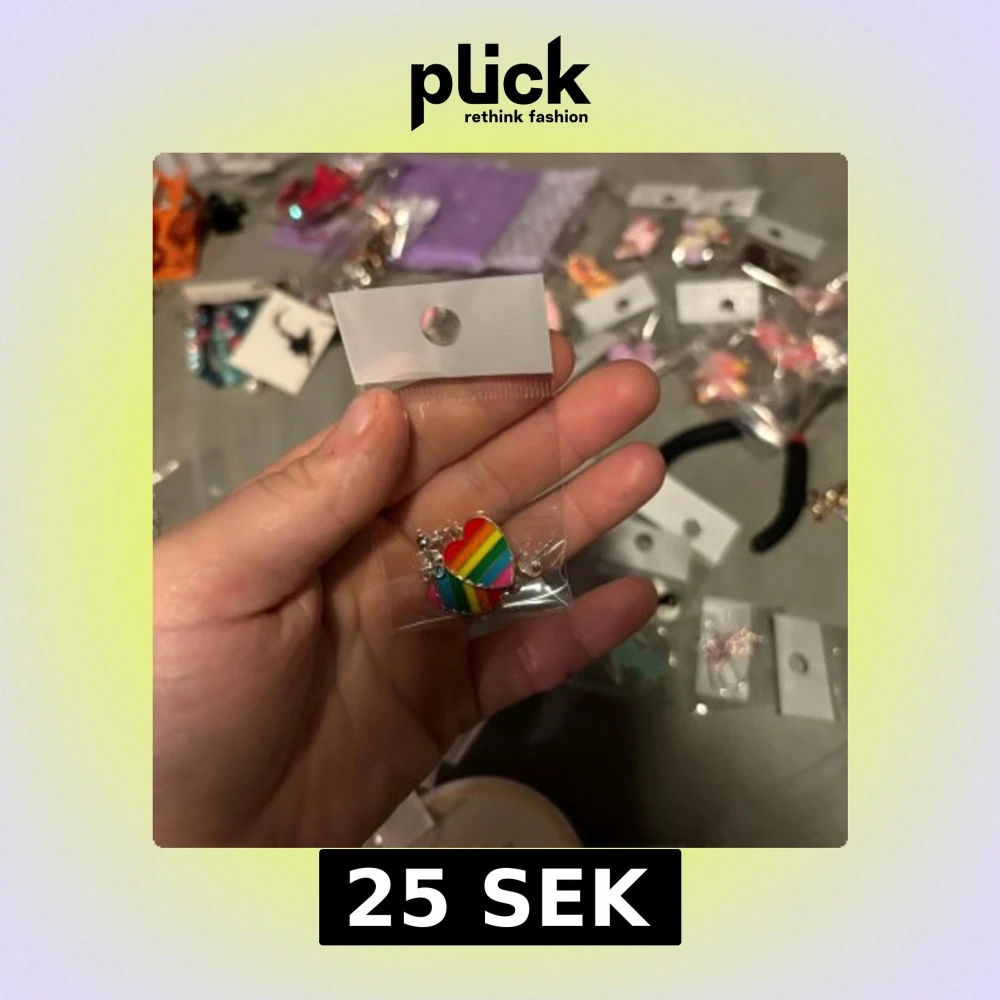 Säljer ett färgglatt örhänge i form av ett hjärta med regnbågsfärger. Perfekt för att lägga till en pop av färg till din outfit. Örhänget är förpackat i en plastpåse.