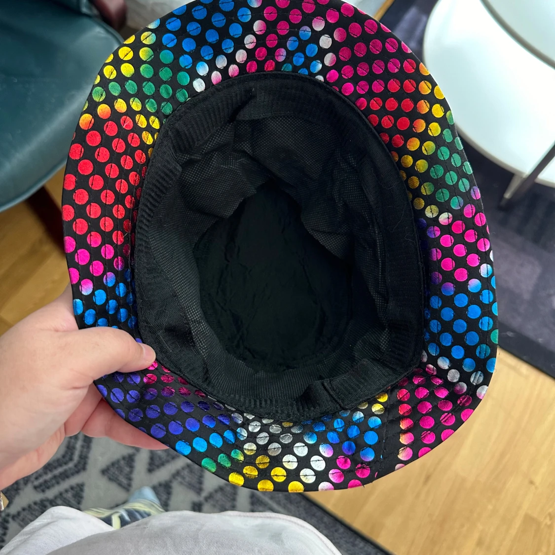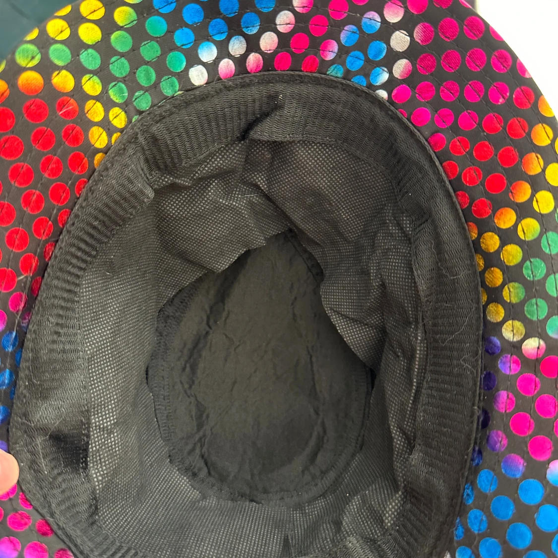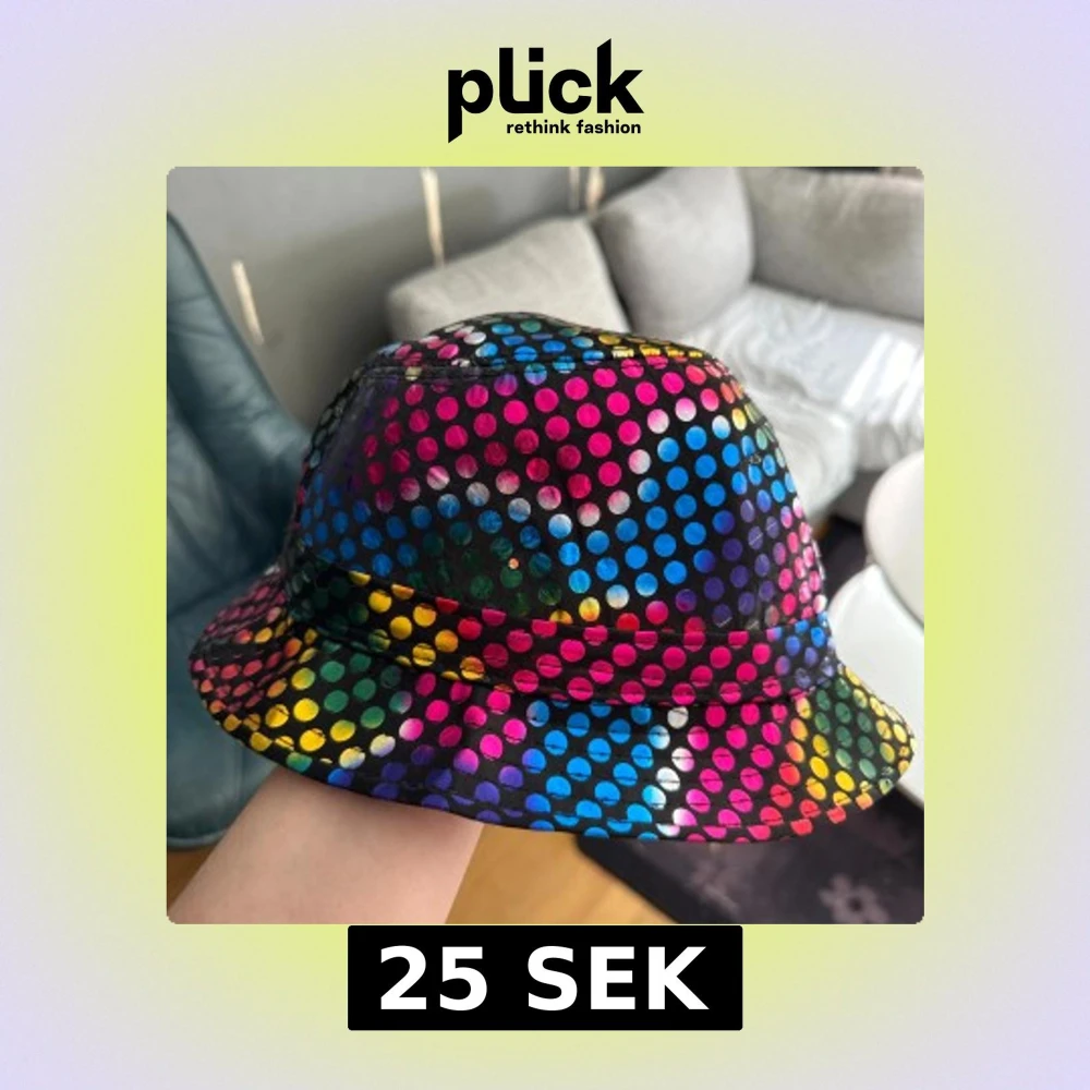 Färgstark bucket hat med regnbågsfärgade prickar på svart botten. Hatten har en klassisk rund form och bred brätte, perfekt för att sticka ut i mängden. Materialet är syntet och insidan är svart. Grym accessoar för dig som gillar att synas!